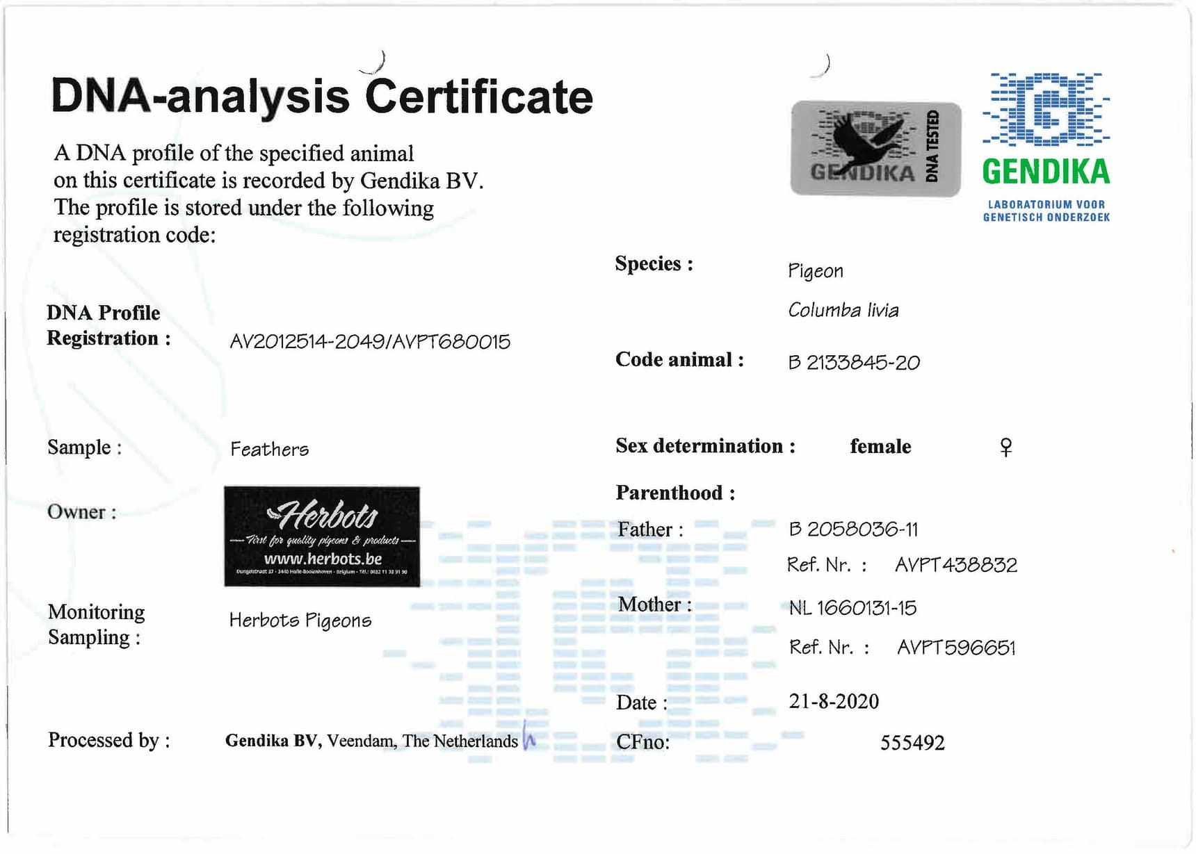 A direct daughter "Orange King" wins at Leutenez Milan 1st prize Pont 429 yearbirds (2nd against 759 old + yearbirds - 6th Combine 2,309 old and yearbirds)