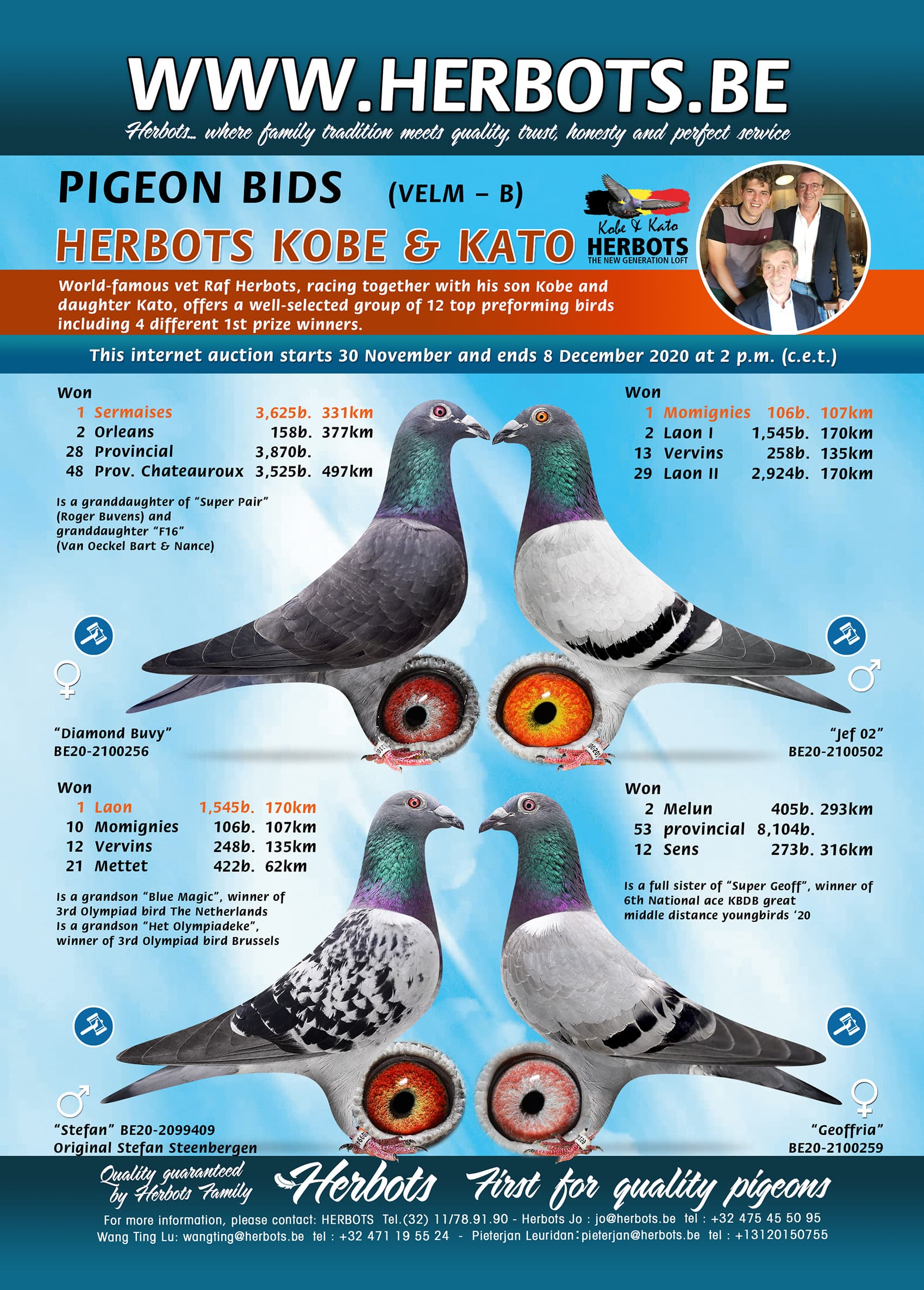 World-famous vet Raf Herbots, racing together with his son Kobe and daughter Kato, offers a well-selected group of 12 top preforming birds including 4 different 1st prize winners.