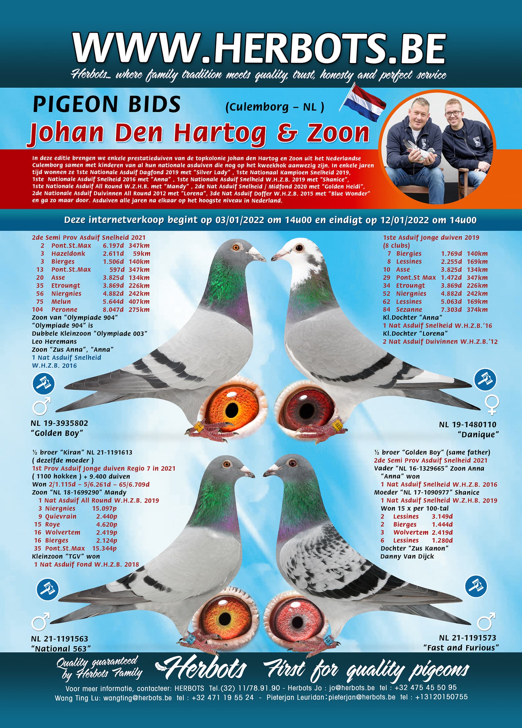 In deze editie brengen we enkele prestatieduiven van de topkolonie Johan Den Hartog en Zoon uit het Nederlandse Culemborg samen met kinderen van al hun nationale asduiven die nog op het kweekhok aanwezig zijn. In enkele jaren tijd wonnen ze 1ste Nationale Asduif Dagfond 2019 met “Silver Lady” , 1ste Nationaal Kampioen Snelheid 2019, 1ste Nationale Asduif Snelheid 2016 met “Anna” , 1ste Nationale Asduif Snelheid W.H.Z.B. 2019 met "Shanice", 1ste Nationale Asduif All Round W.Z.H.B. met “Mandy” , 2de Nat Asduif Snelheid / Midfond 2020 met “Golden Heidi”, 2de Nationale Asduif Duivinnen All Round 2012 met “Lorena”, 3de Nat Asduif Doffer W.H.Z.B. 2015 met “Blue Wonder” en ga zo maar door. Asduiven alle jaren na elkaar op het hoogste niveau in Nederland.