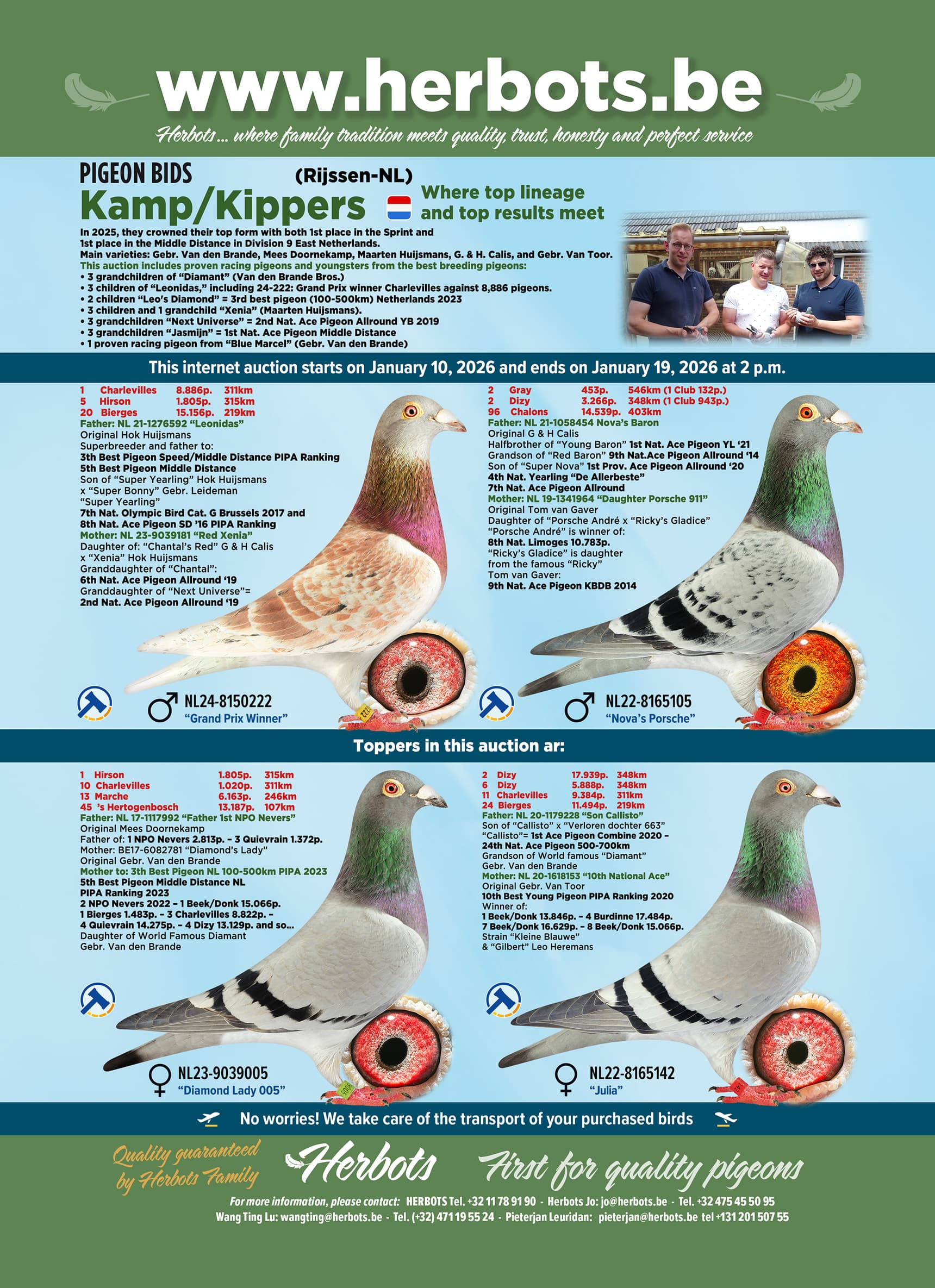 - Meerdere (semi)provinciale overwinningen tegen duizenden duiven met rechtstreekse en 100% Kamp-Kippers duiven