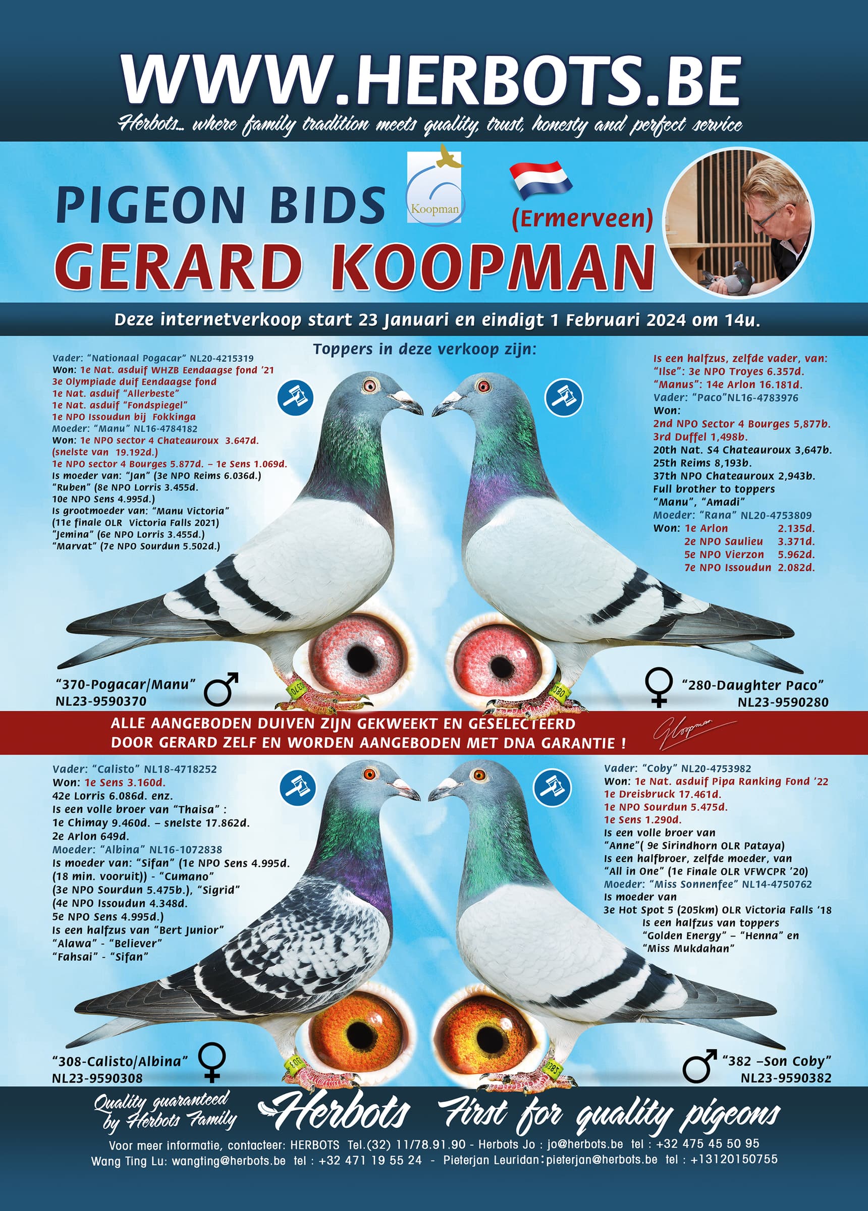 Fanciers Verkerk G. & S. (Reeuwijk) bred out a daughter of "Manu" topbird "NL22-8459329", who is 1st National ace old bird The Netherlands 2023