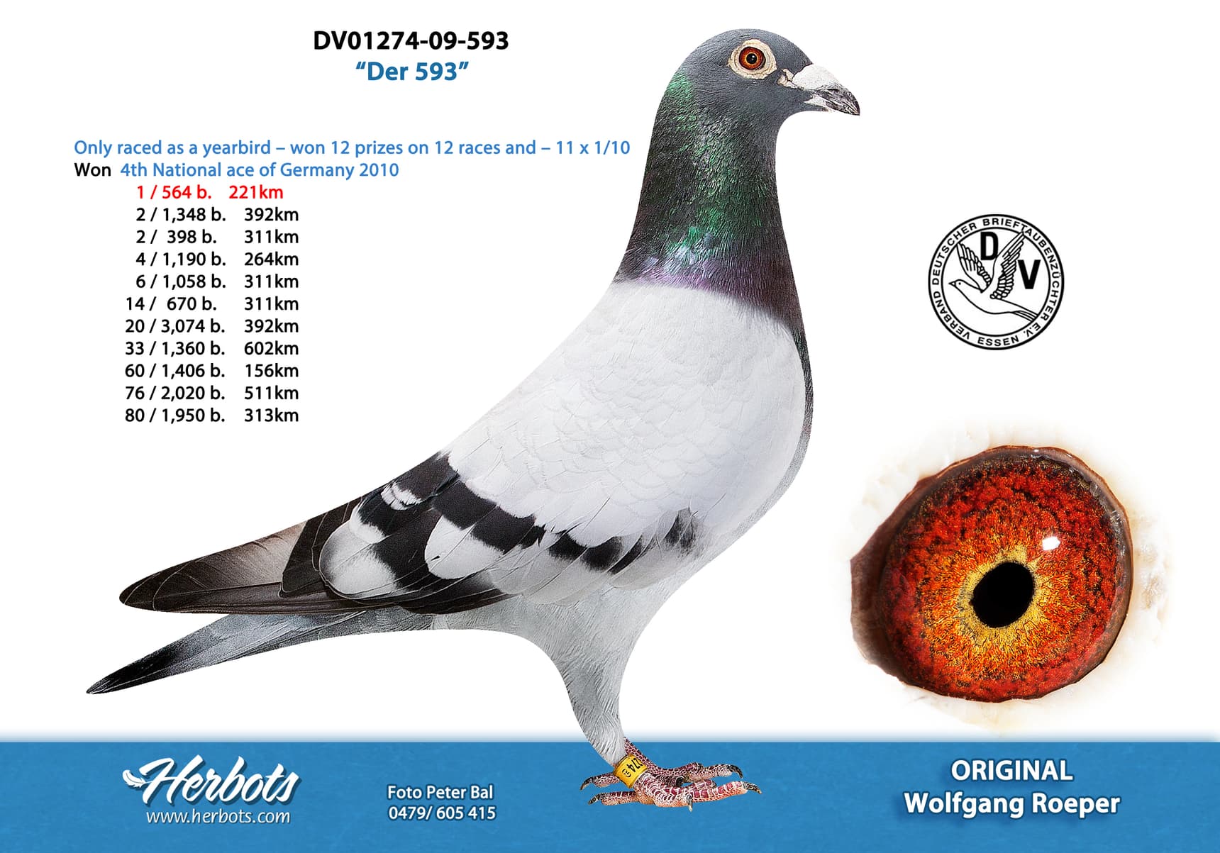 Direct daughter “Der 593” (all info see above) x “B14-2237485” (daughter Olympiad bird and 3rd Nat. Ace KBDB “Bolleke Watten Junior”