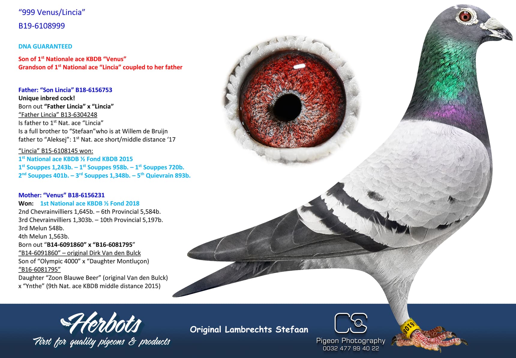 Lambrechts Stefaan: DNA certified cock out "Inbred Lincia" (born out "Father Lincia" x 1st Nat. ace KBDB "Lincia") x "Venus" (1st Nat. ace KBDB 1/2 Fond '18)