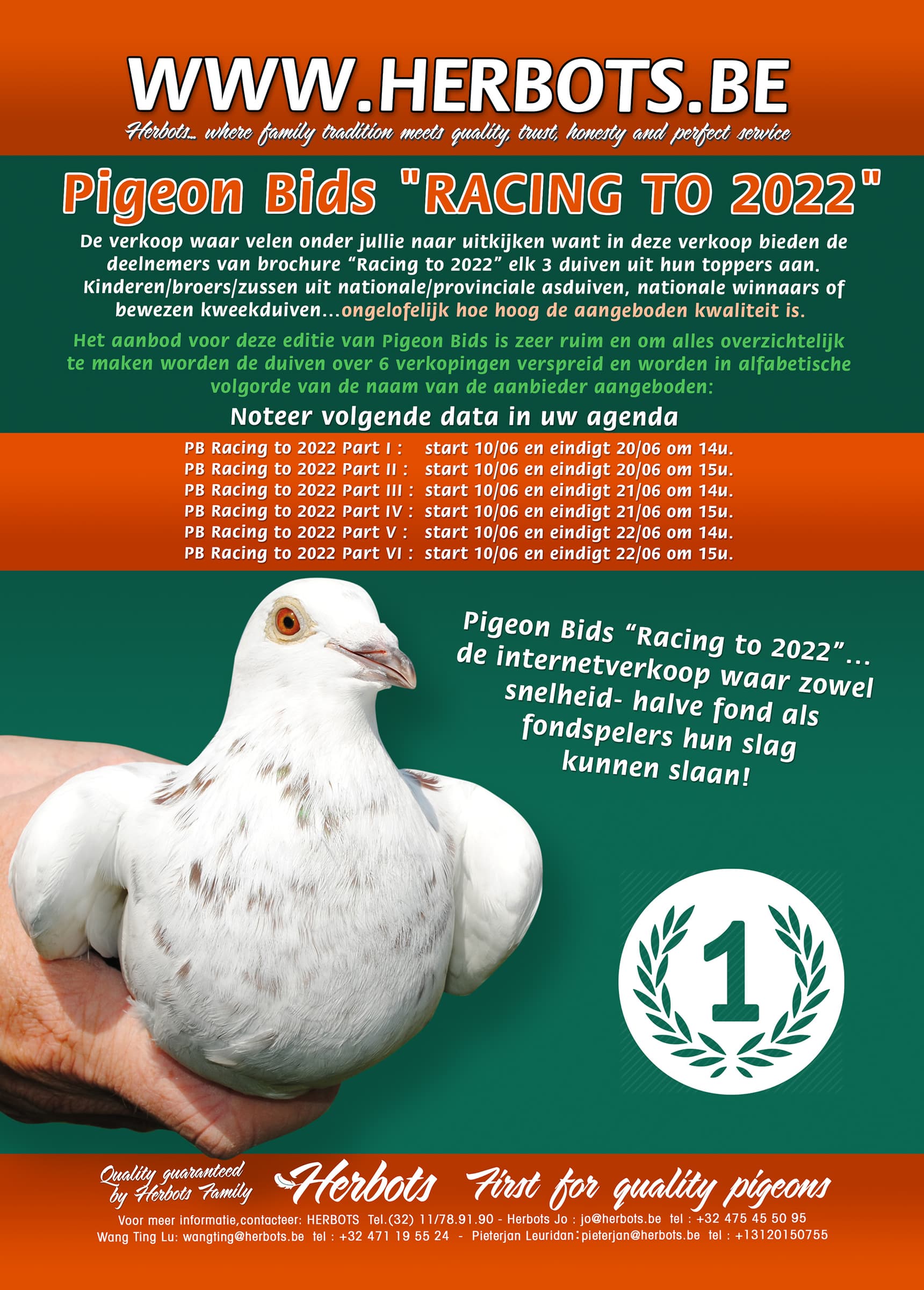 In deze editie van Pigeon Bids bieden deelnemers van de bekende brochure "Racing To 2022" elk 3 duiven aan uit hun bekende kwekers.