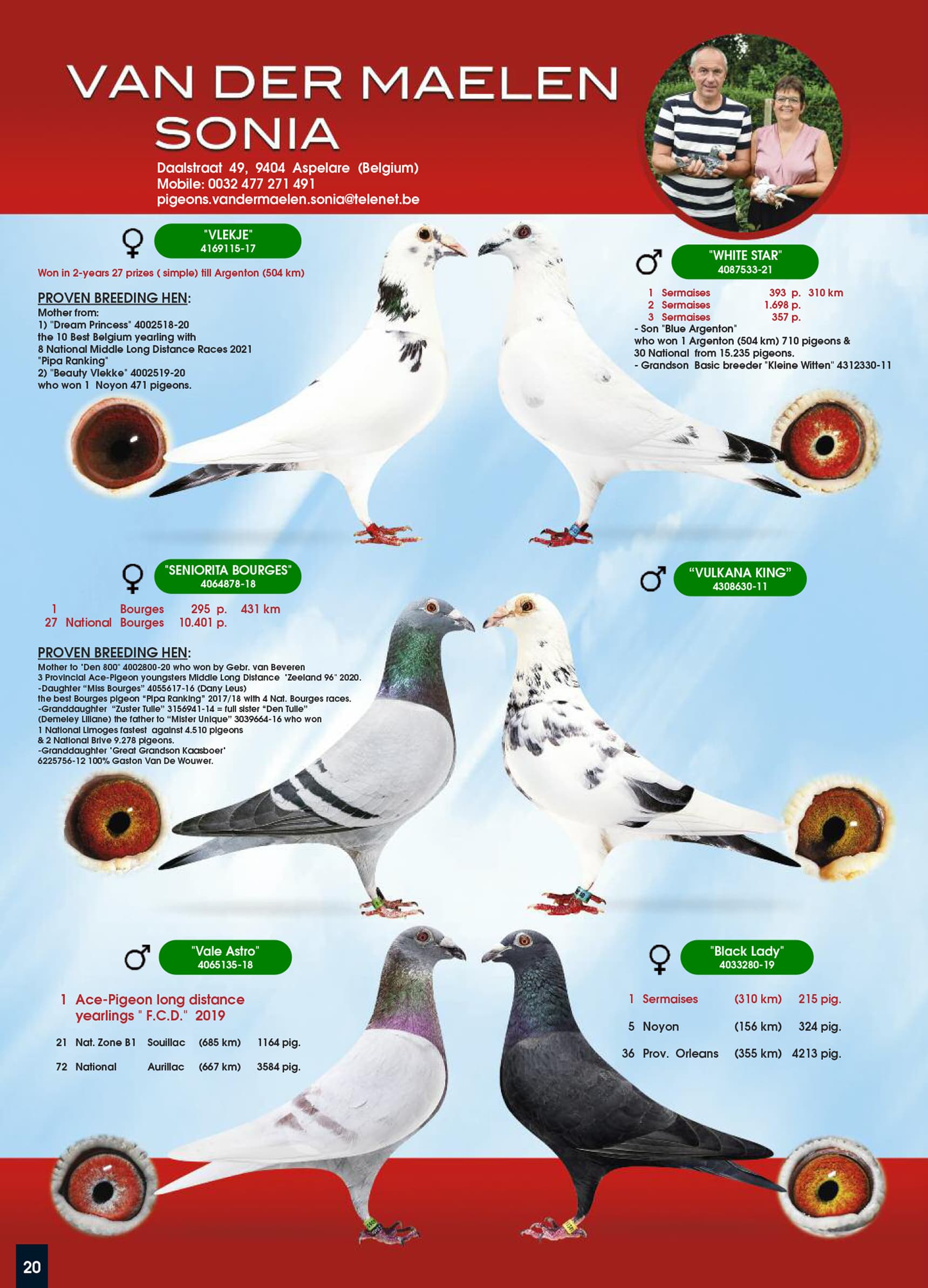 Won: 2nd Argenton 118b. – 16th Toury 488b. - 16th Noyon 1,210b. – 21st Noyon 1,096b. - 24th Noyon 646b. – 574th Nat. Argenton 21,915b..