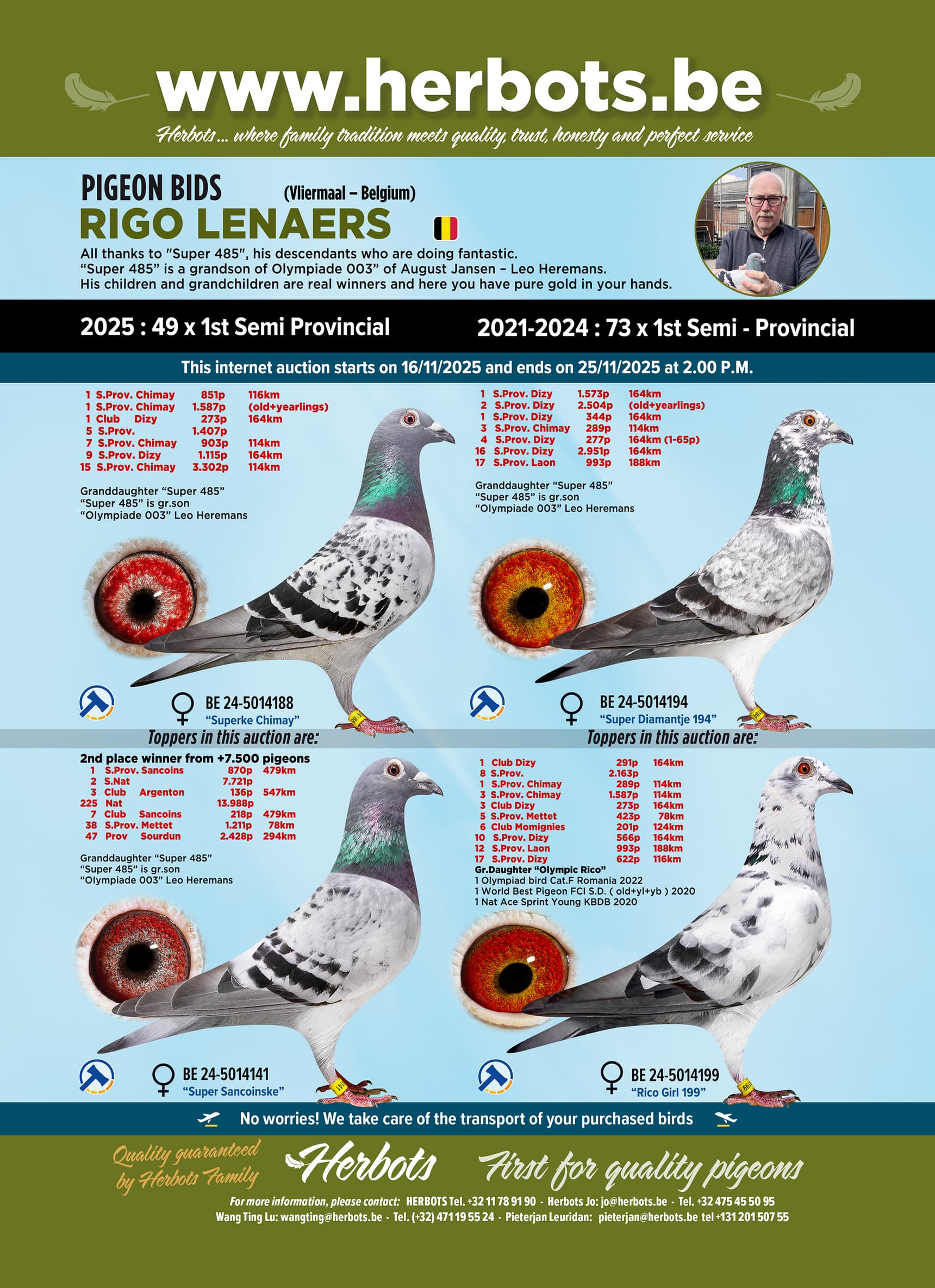 "Super 485" is een kleinzoon van Olympiade 003" van August Jansen – Leo Heremans. Zijn kinderen en kleinkinderen zijn echte toppers en hier heeft u puur goud in handen.