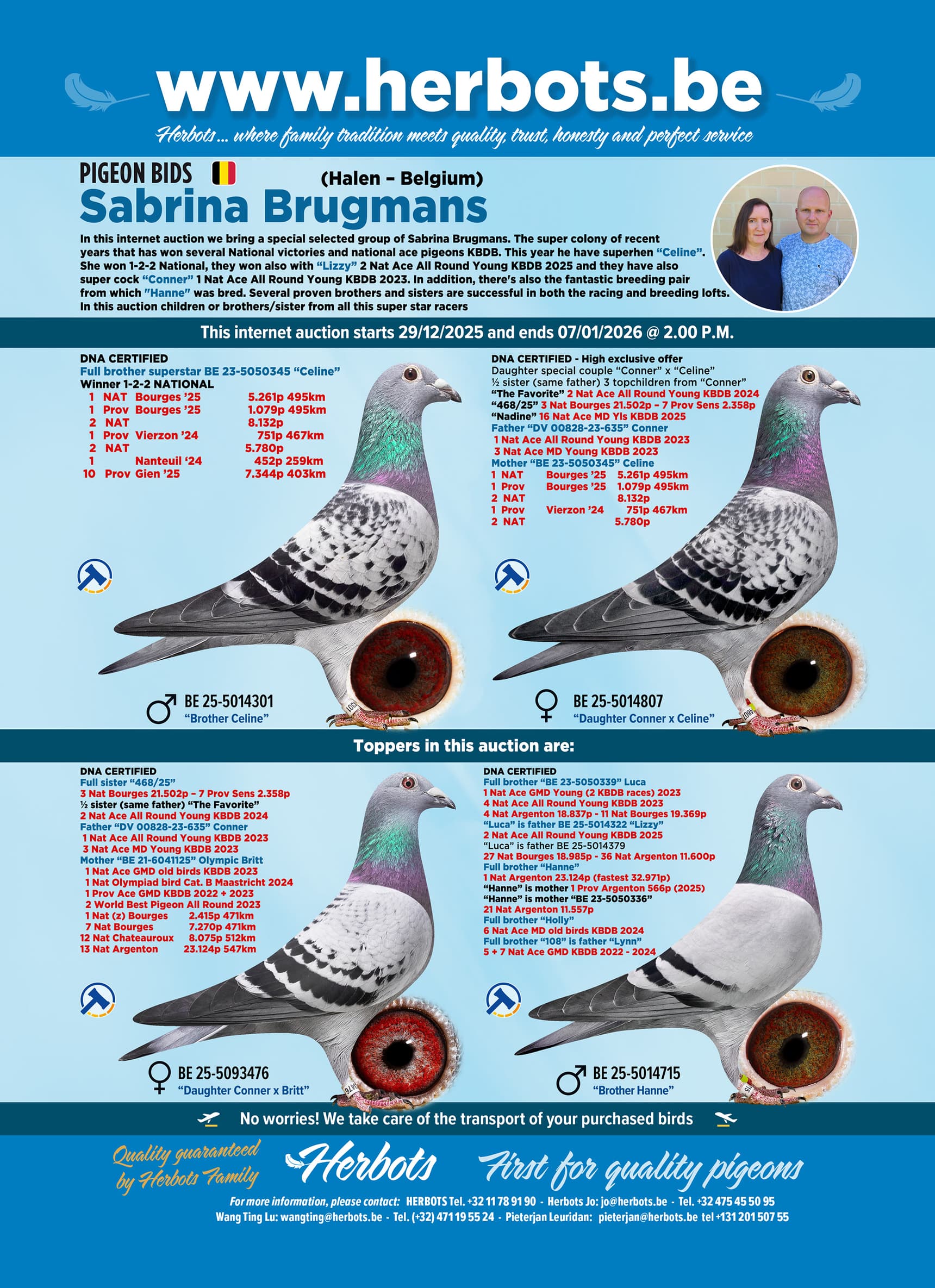 In deze internet veiling brengen we een speciaal geselecteerde groep van Sabrina Brugmans. De superkolonie van de afgelopen jaren die al meerdere nationale overwinningen en nationale asduiven KBDB behaalde. Dit jaar hebben ze superduivin "Celine". Zij won 1-2-2 Nationaal, ze wonnen met "Lizzy" ook 2e Nat Asduif Allround Jonge KBDB 2025 en ze hebben ook superdoffer "Conner" 1e Nat Asduif Allround Jonge KBDB 2023. Daarnaast is er ook het fantastische kweekkoppel waaruit "Hanne" is gekweekt. Verschillende bewezen broers en zussen presteren succesvol op zowel de vlieg- als kweekhokken. In deze veiling kinderen of broers/zussen van al deze supervliegers.