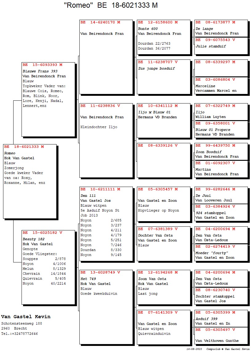 Direct daughter “Den 111” (5th ace Noyon club) x “Het 749” (champion breeding hen)