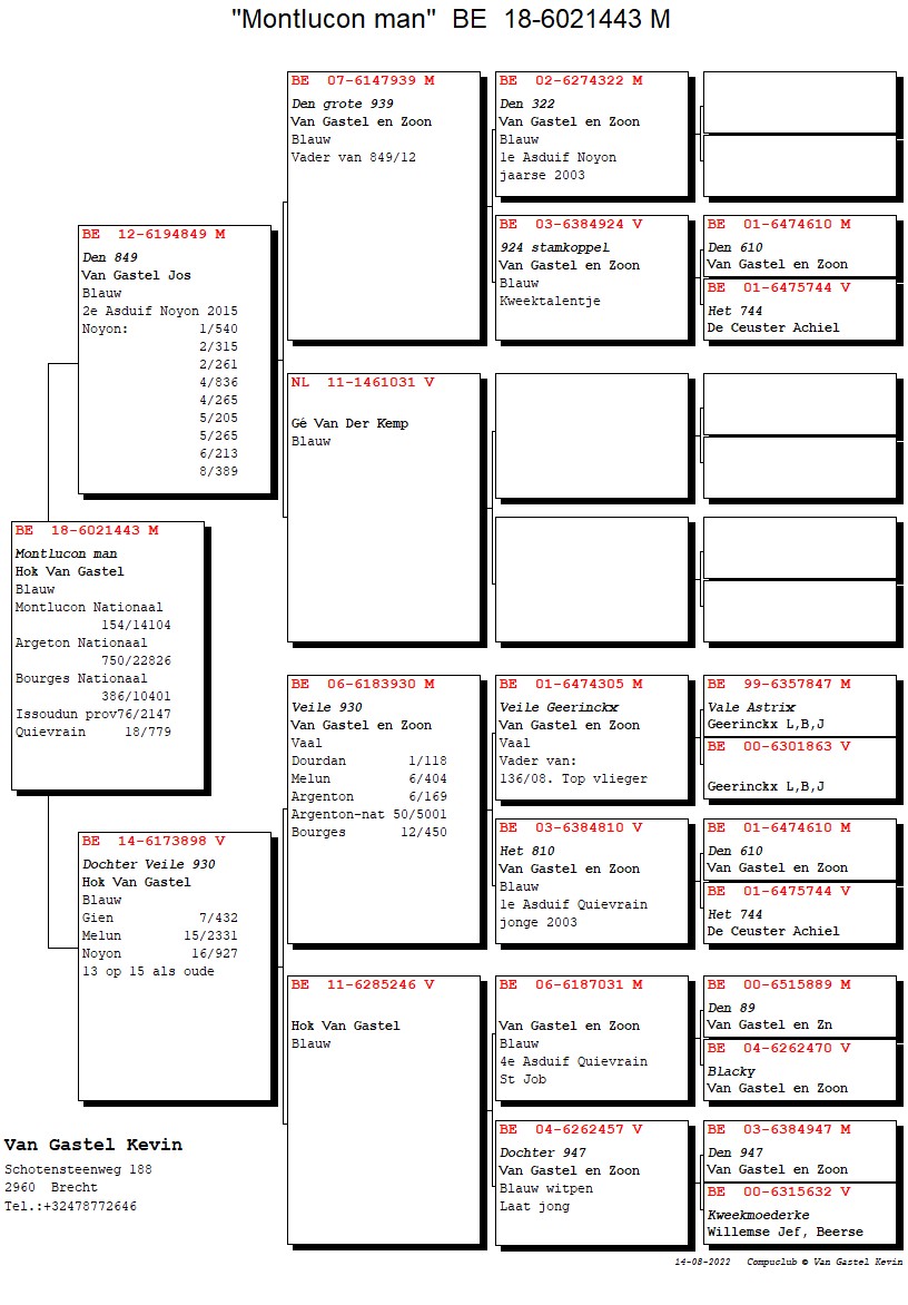 Won 13 prizes on 15 races as old bird: 7th Gien 432b. – 15th Melun 2,331b. - 16th Noyon 927b.