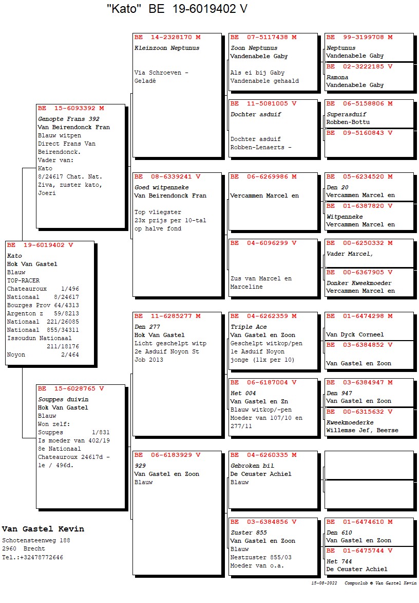 Direct son “Grandson Neptunus” (Gaby Vandenabeele) x “Goed Witpenneke” (won 23 x 1/10 on ½ Fond)