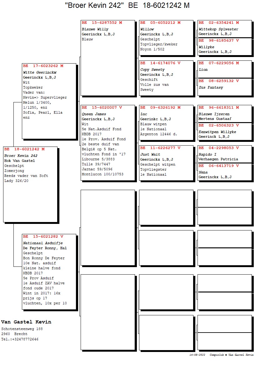 5th Nat. ace KBDB Fond - 2nd best bird of Belgium on 5 national races – 4 x Top-100 national winner