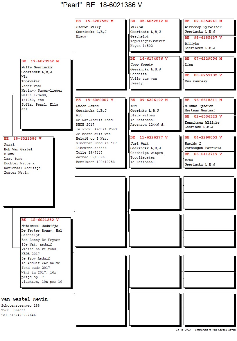 Is mother to “Pareltje”: 3 prizes on 3 national races as yearbird – 16 prizes on 17 races a yearbird – 6 x 1/10