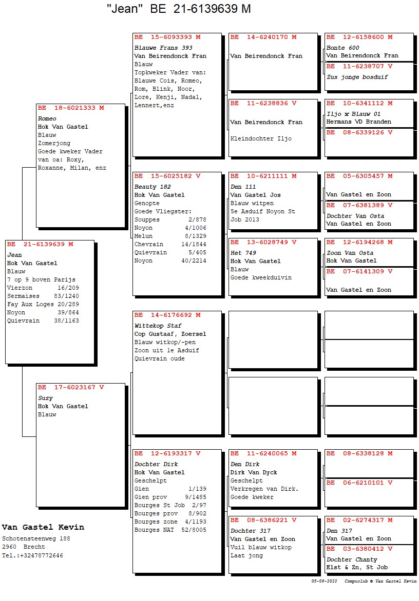 Born out “Blauwe Frans 393” (father to several toppers - original Frans Van Beirendonck) x “Beauty 182” (Won: 2nd Souppes 878b. – 4th Noyon 1,006b. - 8th Melun 1,329b. – 14th Chevrainvilliers 1,844b. - 5th Quievrain 405b. – 40th Noyon 2,214b.)