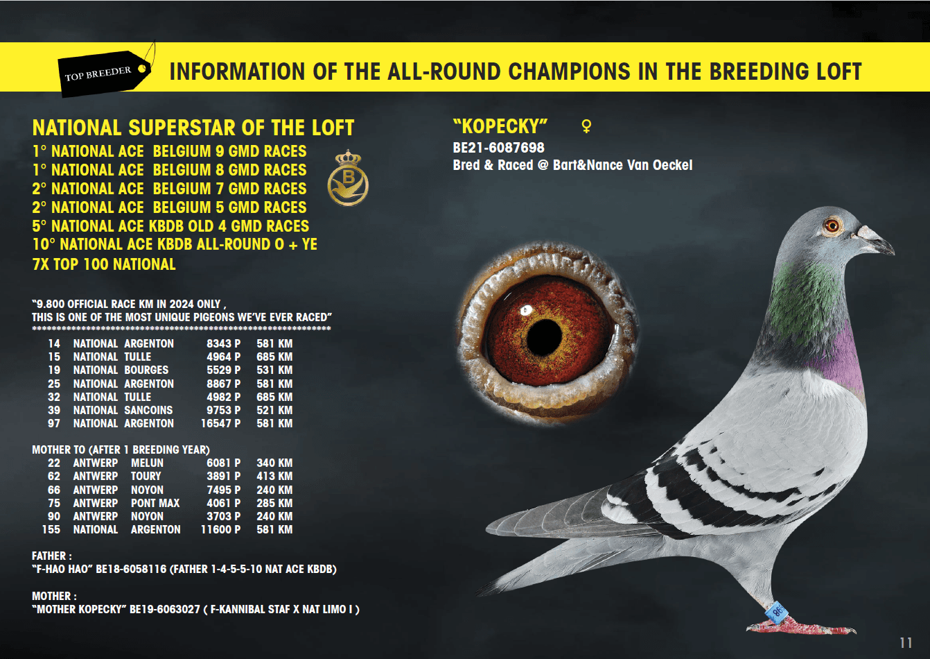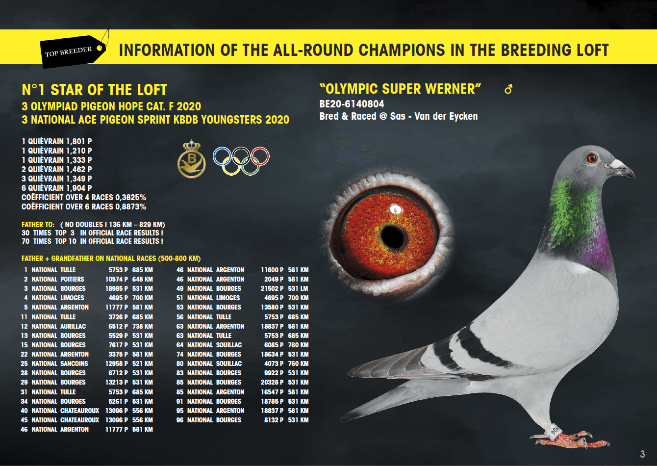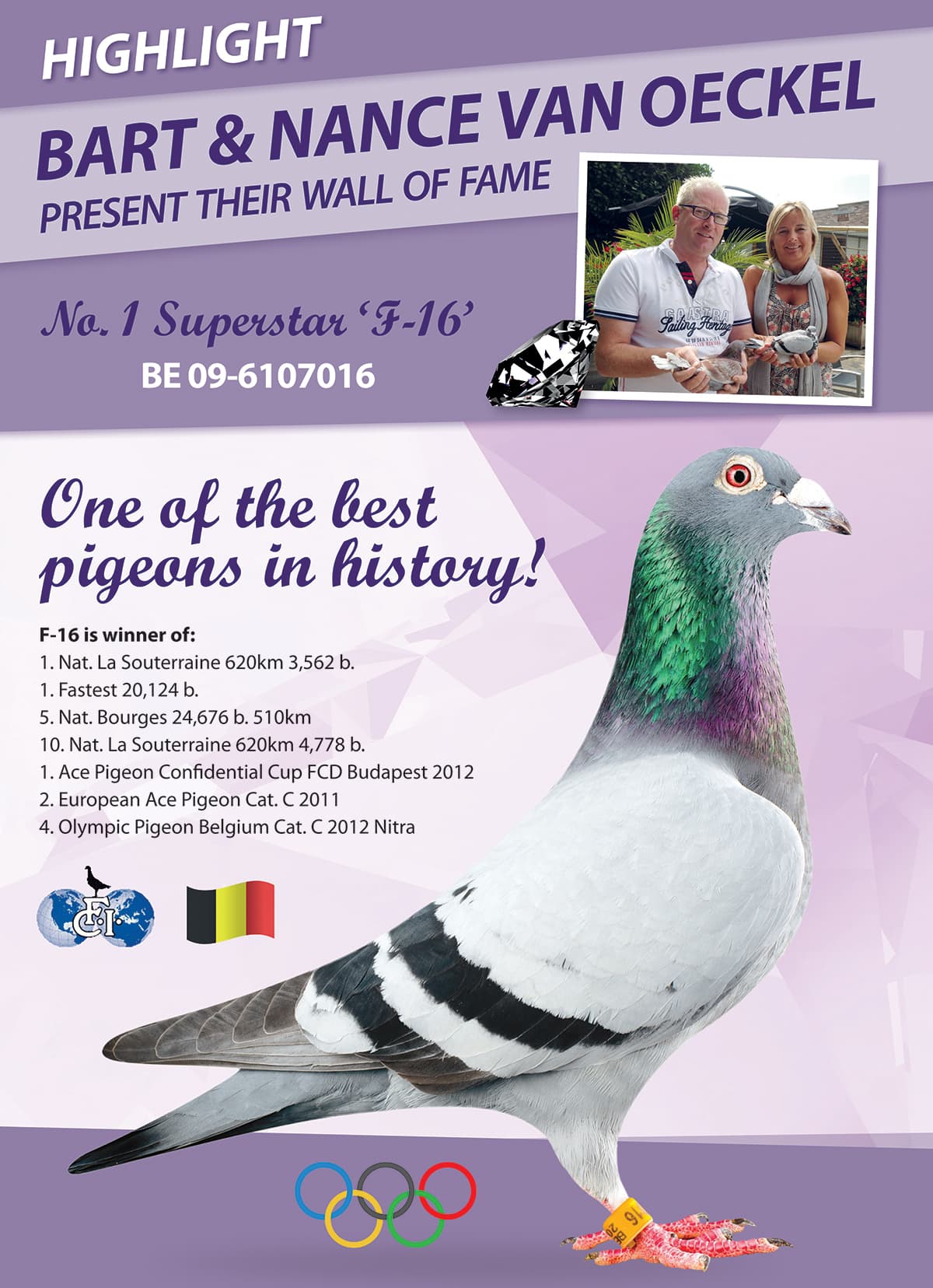 Won: 1st Best bird of Belgium on 8 and 9 national races