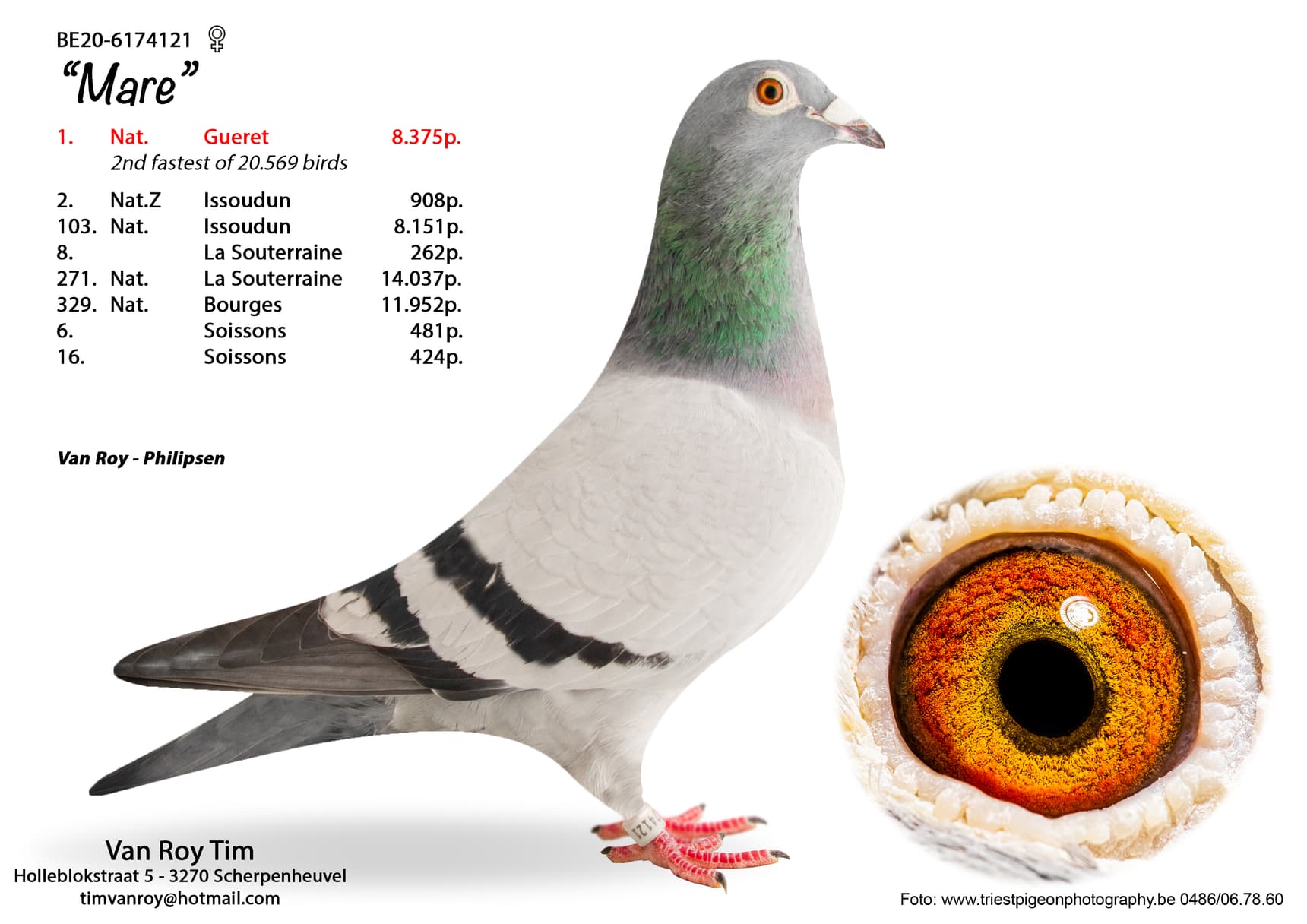 Born out “B15-6288437” (original Luyckx Raf – son 1st Prov. Jarnac – grandson Olympiad bird “Kleine Lars”) x “Granddaughter Marcel” (100% Van de Merwe P.)