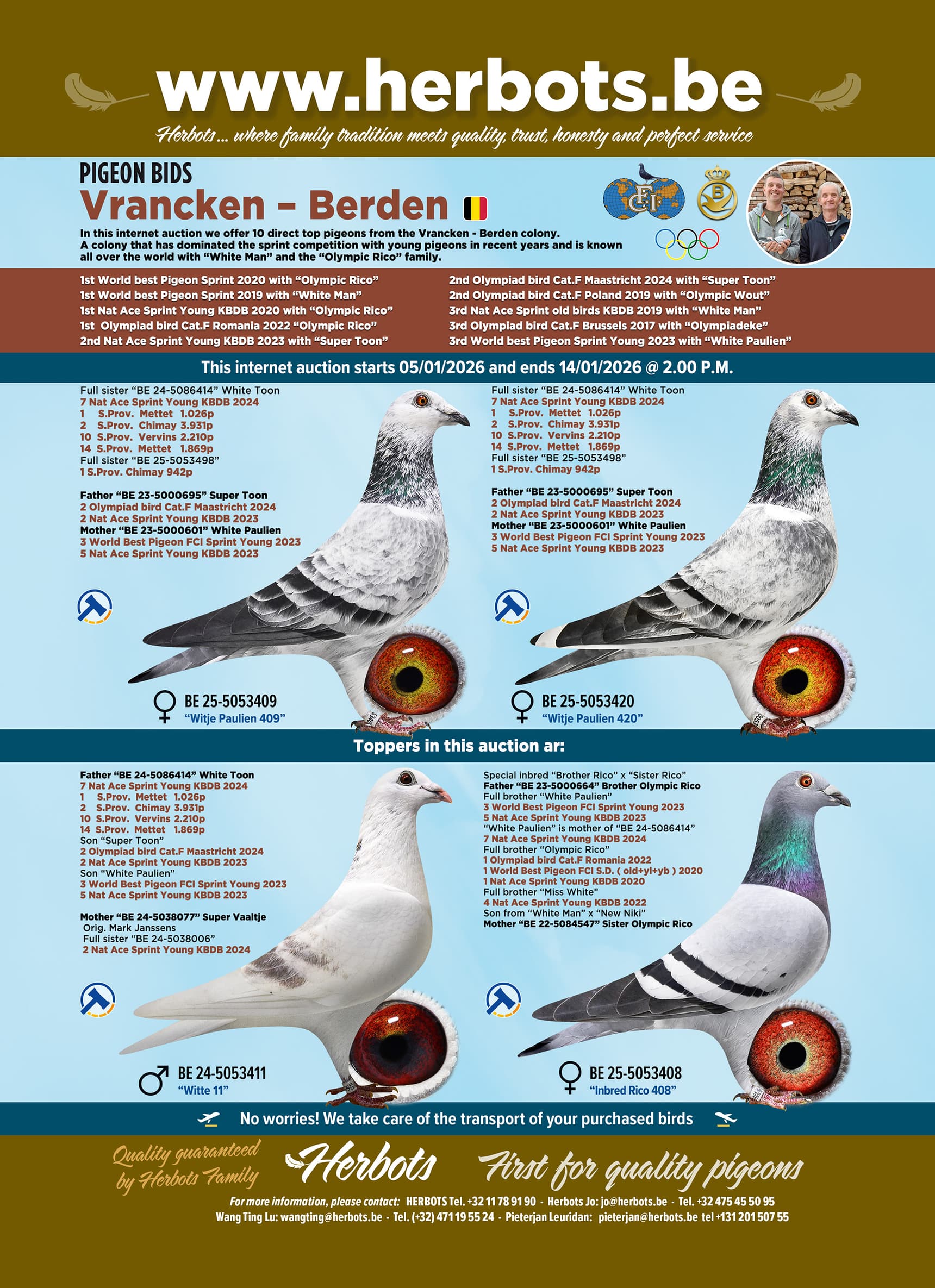 In deze internetveiling bieden wij 10 directe topduiven aan van de kolonie Vrancken - Berden.