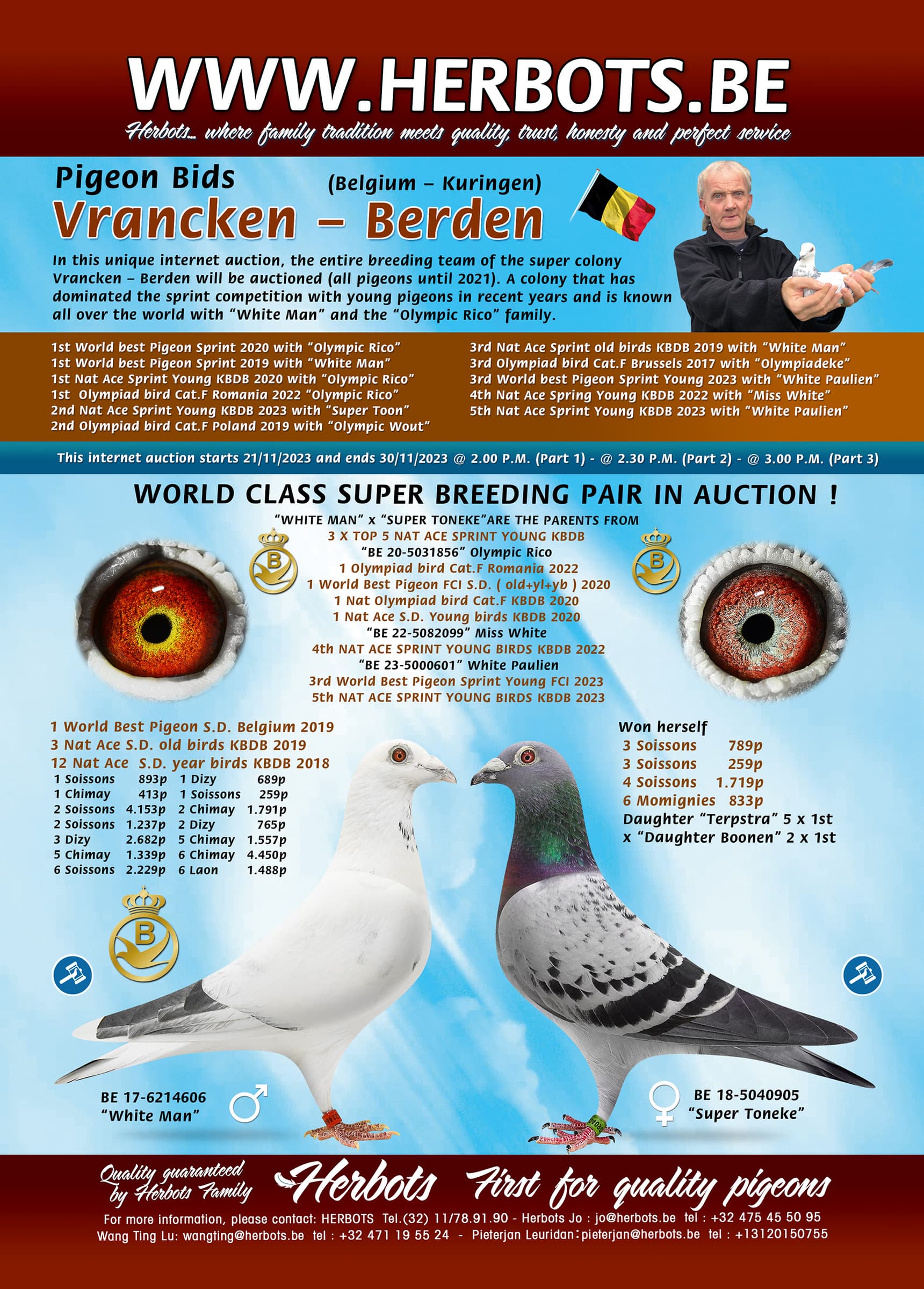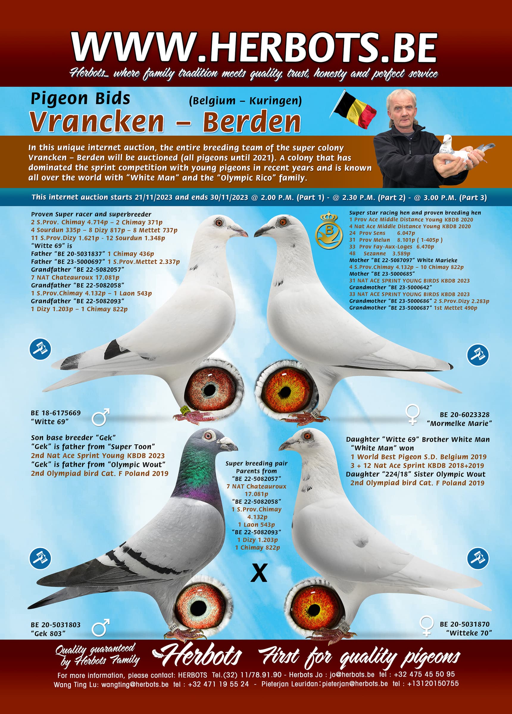 In deze unieke internetverkoop komt de hele kweekploeg van de superkolonie Vrancken – Berden in veiling ( alle duiven t.e.m. 2021 ). Een kolonie die met jonge duiven op de snelheid de laatste jaren domineert en met “White Man” en de familie van “Olympic Rico” overal ter wereld bekend is.