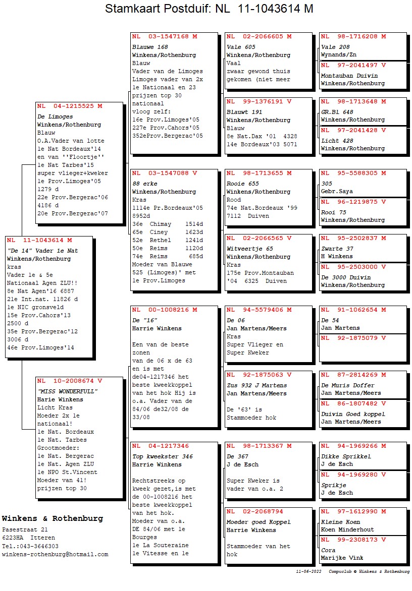 Won 1st Prov. Limoges 1,279b. and is father to “Lotte” (1st Nat. Bordeaux ’14) and “Floortje” (1st Nat. Tarbes ’15)