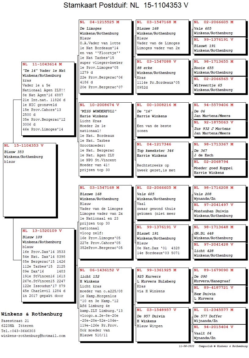 Won 1st Prov. Limoges 1,279b. and is father to “Lotte” (1st Nat. Bordeaux ’14) and “Floortje” (1st Nat. Tarbes ’15)