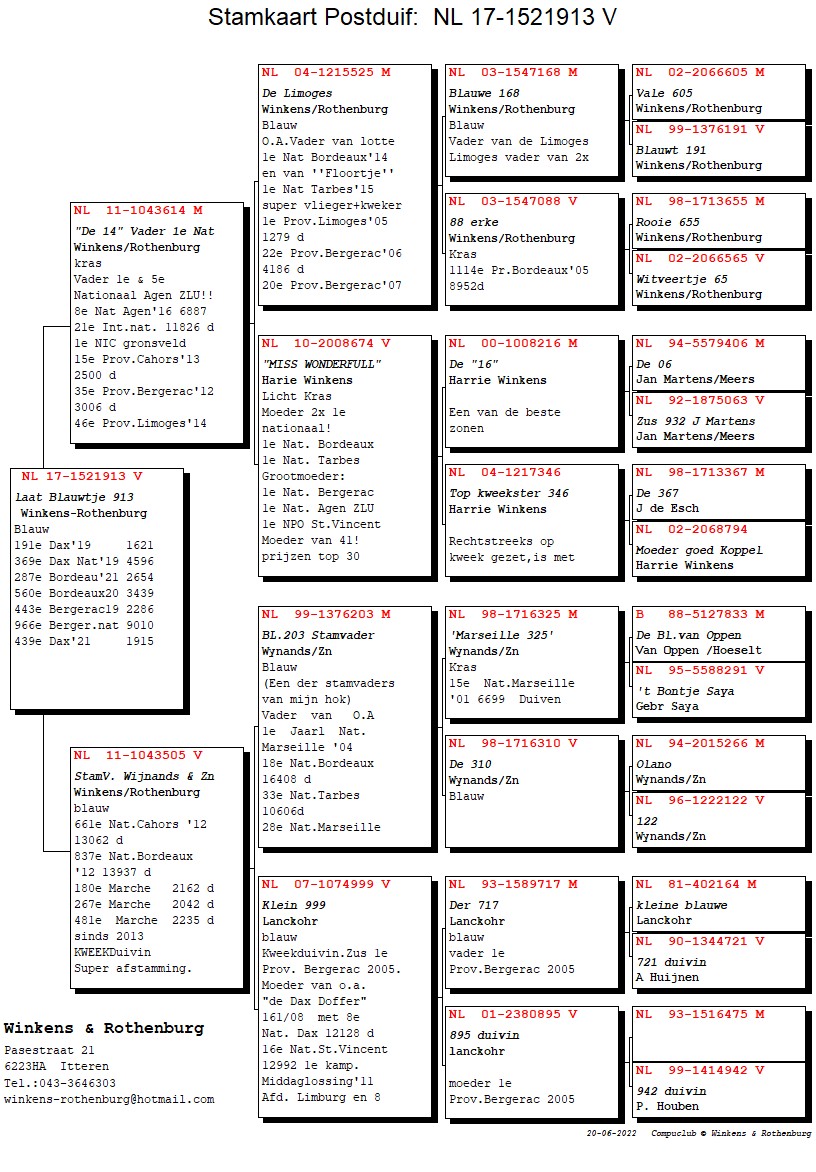 Won 1st Prov. Limoges 1,279b. and is father to “Lotte” (1st Nat. Bordeaux ’14) and “Floortje” (1st Nat. Tarbes ’15)