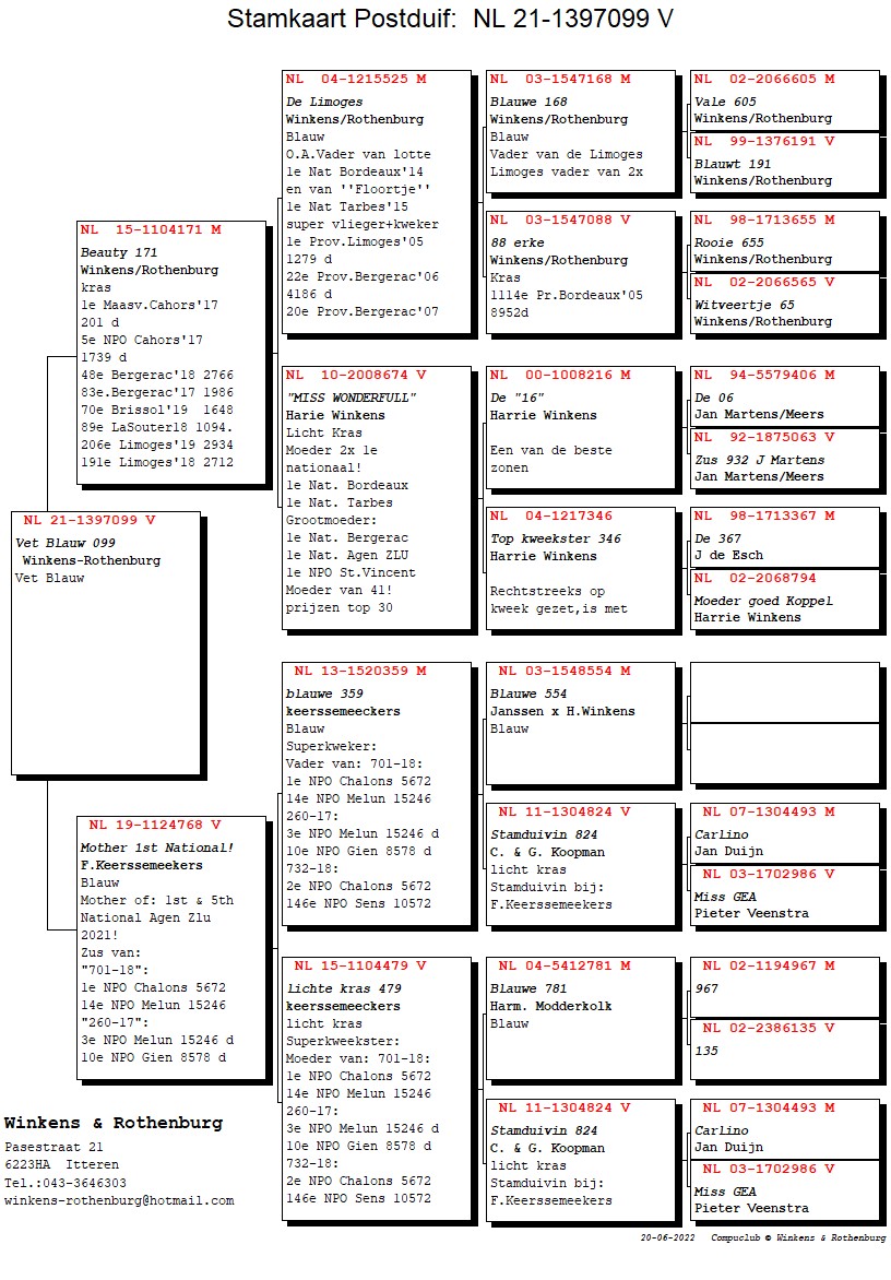 Won 1st Prov. Limoges 1,279b. and is father to “Lotte” (1st Nat. Bordeaux ’14) and “Floortje” (1st Nat. Tarbes ’15)