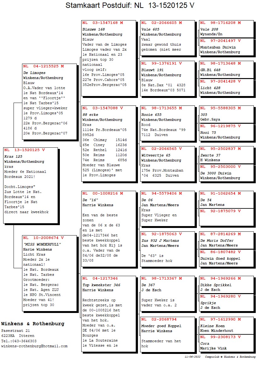 Won 1st Prov. Limoges 1,279b. and is father to “Lotte” (1st Nat. Bordeaux ’14) and “Floortje” (1st Nat. Tarbes ’15)