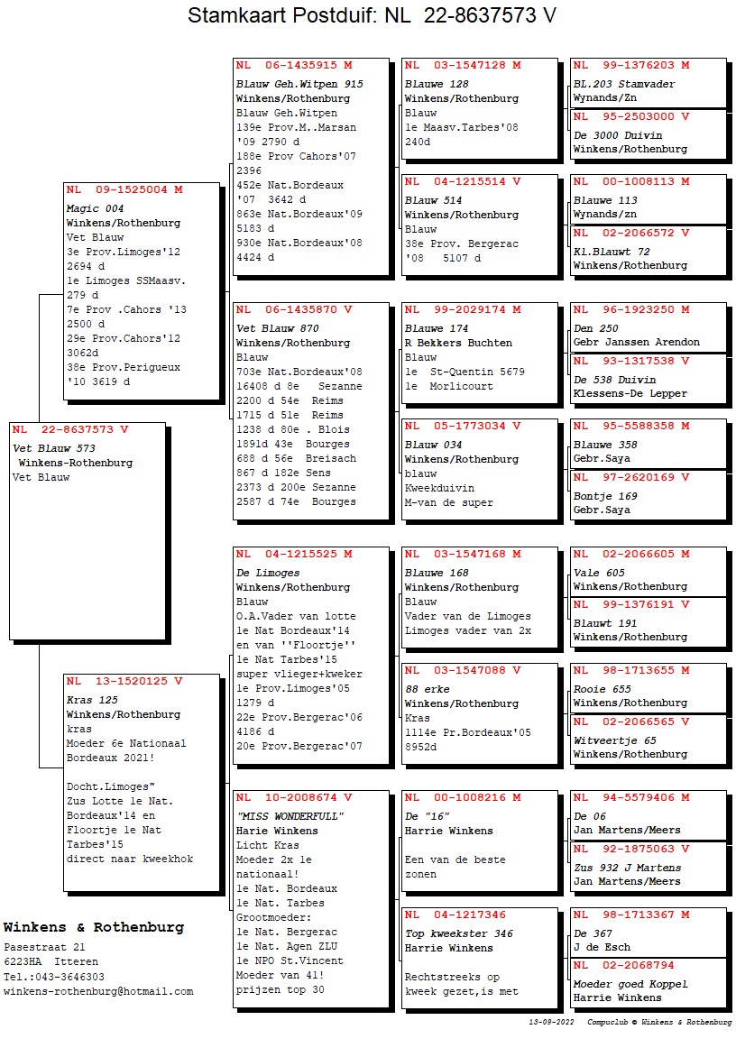Won 1st Prov. Limoges 1,279b. and is father to “Lotte” (1st Nat. Bordeaux ’14) and “Floortje” (1st Nat. Tarbes ’15)