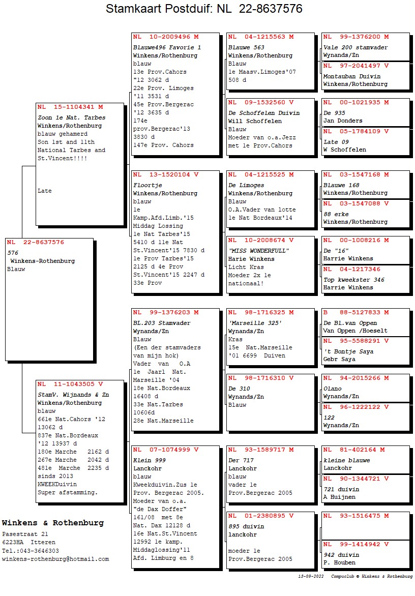 1st ace Afdeling Limburg – 1st Nat. Tarbes 5,410b. - 11th Nat. St. Vincent 7,830b. – 1st Prov. Tarbes 2,125b. – 4th Prov. 2,247b.