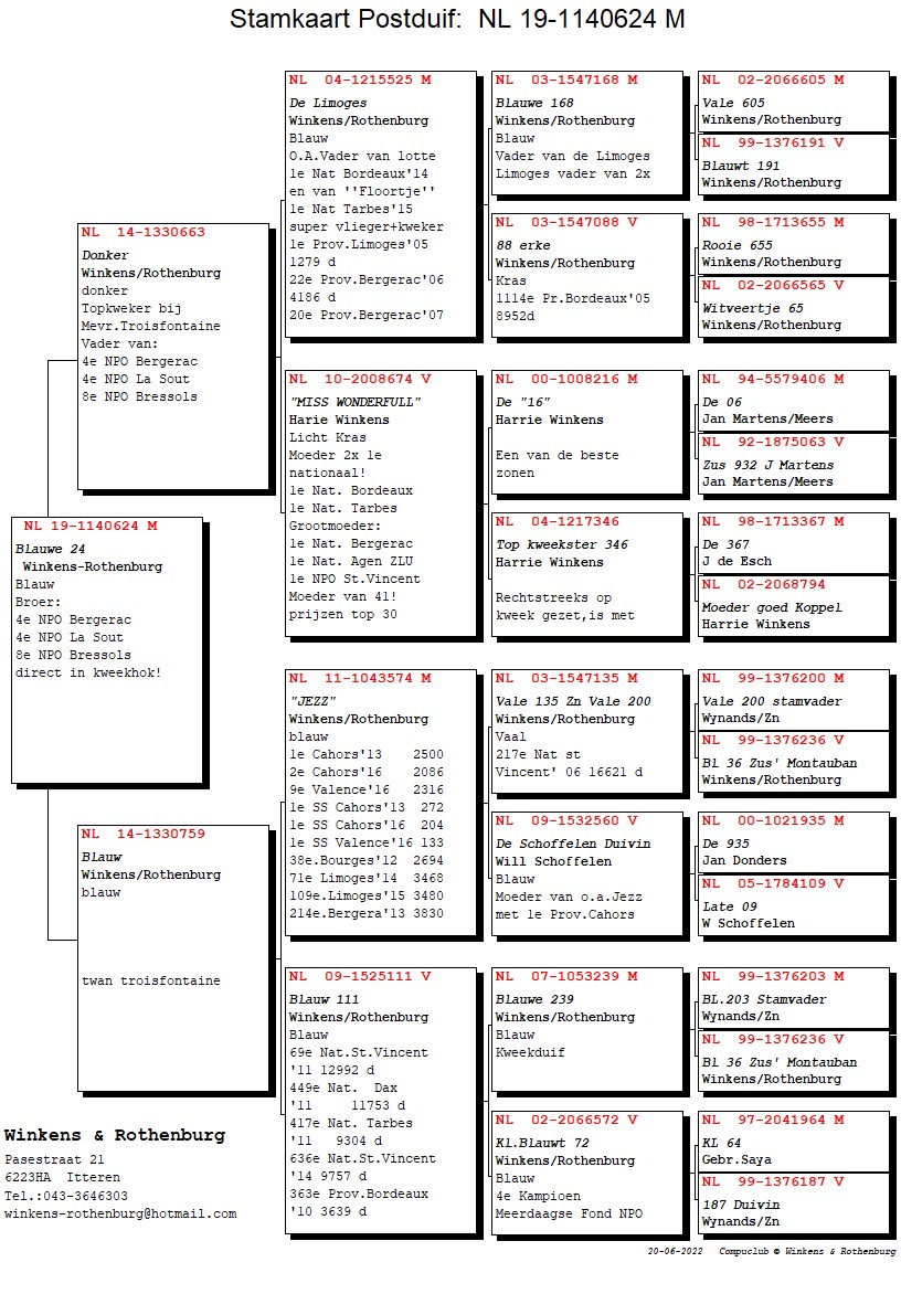 Won 1st Prov. Limoges 1,279b. and is father to “Lotte” (1st Nat. Bordeaux ’14) and “Floortje” (1st Nat. Tarbes ’15)