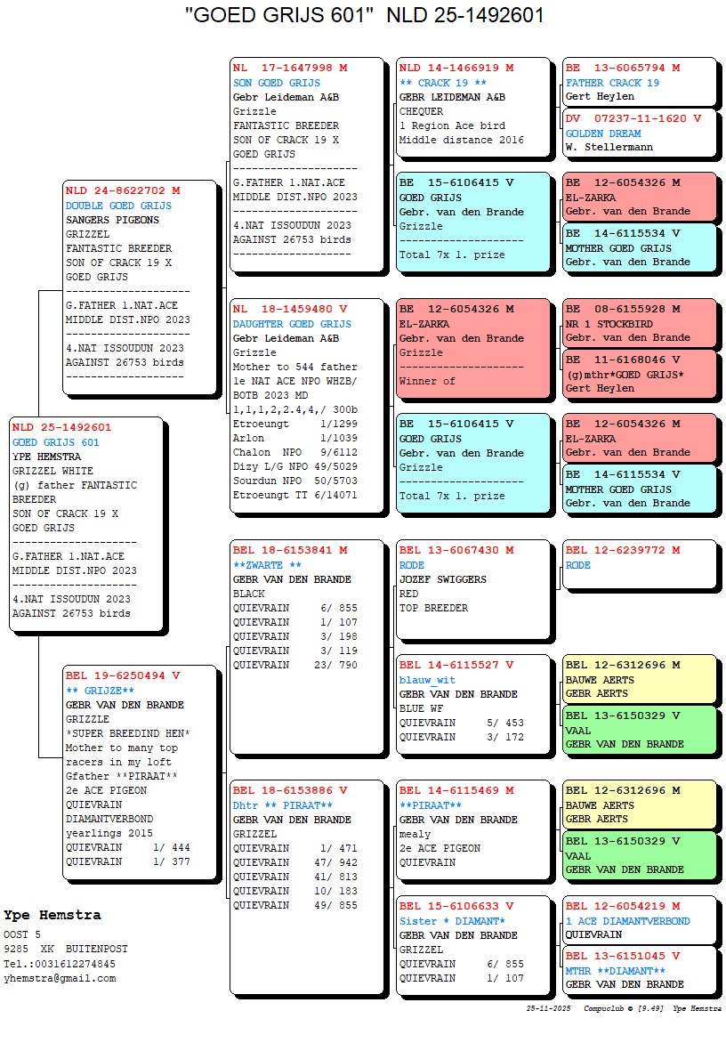 Bred in 3 generations 2 Olympiad birds, 3 x 1st National ace bird, +20 winners in big competion and is father to current base breeder “Arturo”