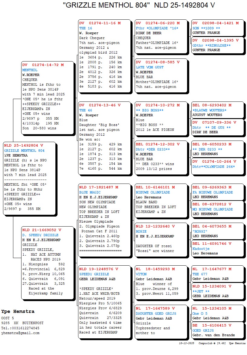 Daughter of “Blue Magic” H. & E.J. Eijerkamp x “Speedy Grizzle” Gebr. Leideman. “Blue Magic” = son “New Olympiade” topbreeder on loft Eijerkamp