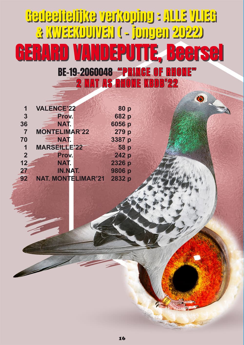 Extreem hoge kwaliteit voor de fondvluchten! 4 Nat. Kampioen 1 + 2 Fond Oude 2021. De '048-19' 2 Nat. As Rhône 2022, Prince du Rhône. De 037-20 'Misses Bape' 10 Nat. As Grote Fond KBDB 2022, ... Gedeeltelijke verkoping, alles behalve de jongen 2022.
