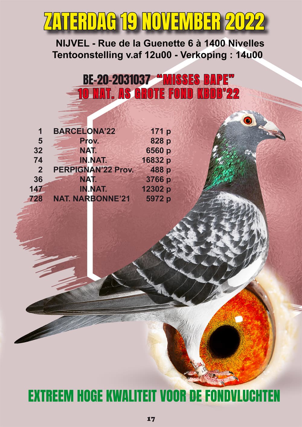 Zaterdag 19 november, Verkoopzaal Nijvel - alle vlieg- en kweekduiven.