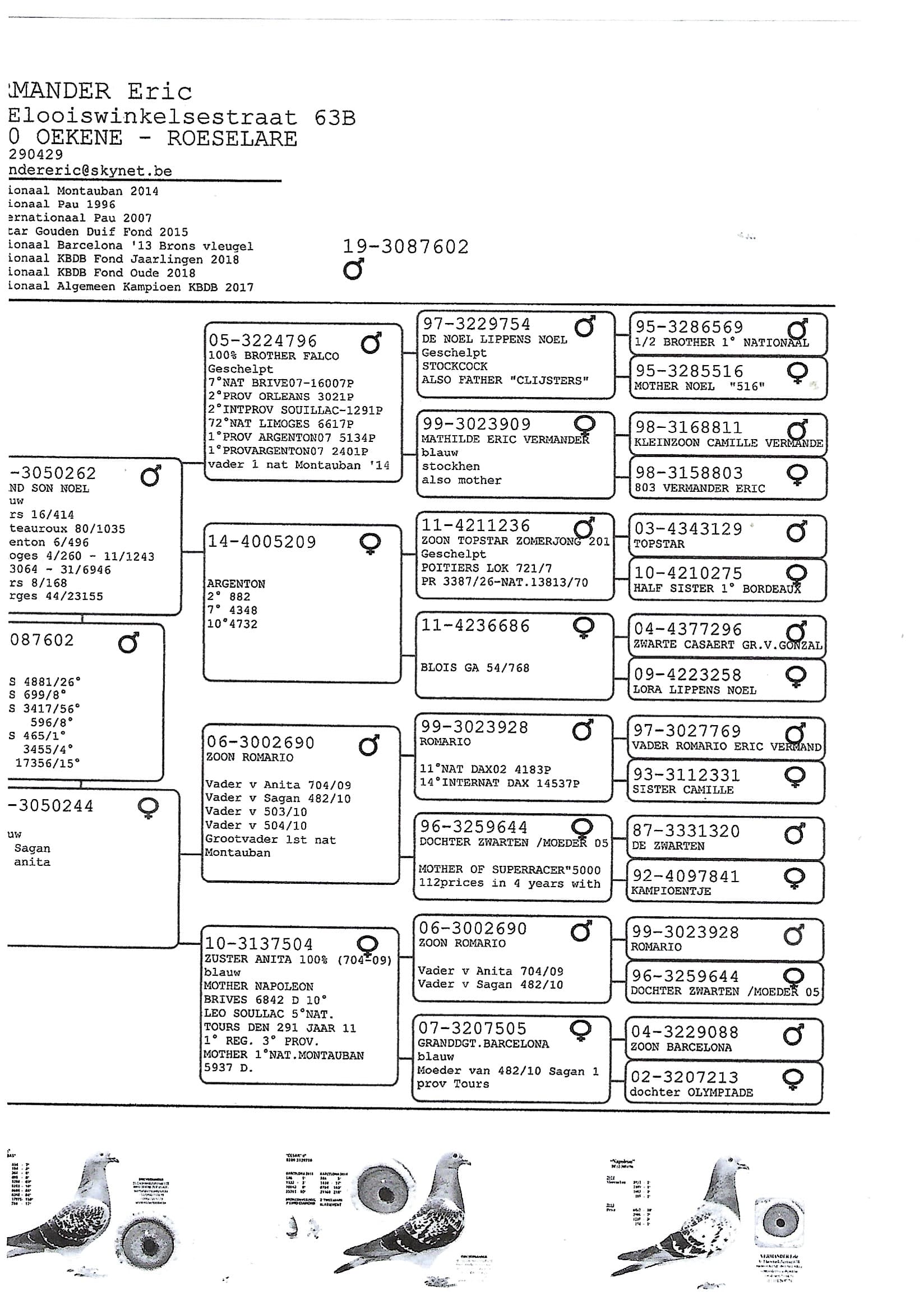 Een andere topspeler met een fijne neus voor topduiven is en was Noël Lippens. En laat die nu toevallig een goede vriend zijn van Eric. Zoals het moet onder vrienden zouden de vruchten van hun samenkweek en vriendschap voor beide partijen tot sterke successen leiden. Noël kreeg een dochter van de “Oude Wittepenne” van Eric en zij werd de moeder van de “Vital”, de 1e nationale asduif fond KBDB 1993. “Vital” werd dan op zijn beurt de grootvader van de wereldberoemde “Bliksem” van Gaby Vandenabeele. En zo leggen we de link met de duiven van Gaby die (uit de lijn van de “Bijter”) ook pakten als boter op de duiven van Eric. Later werd ”Falco” (100 % Eric Vermander) een topduif bij Gaby en kocht Gaby de “Napoleon” van Eric nadat deze de 1e nationaal Montauban had gevlogen.
