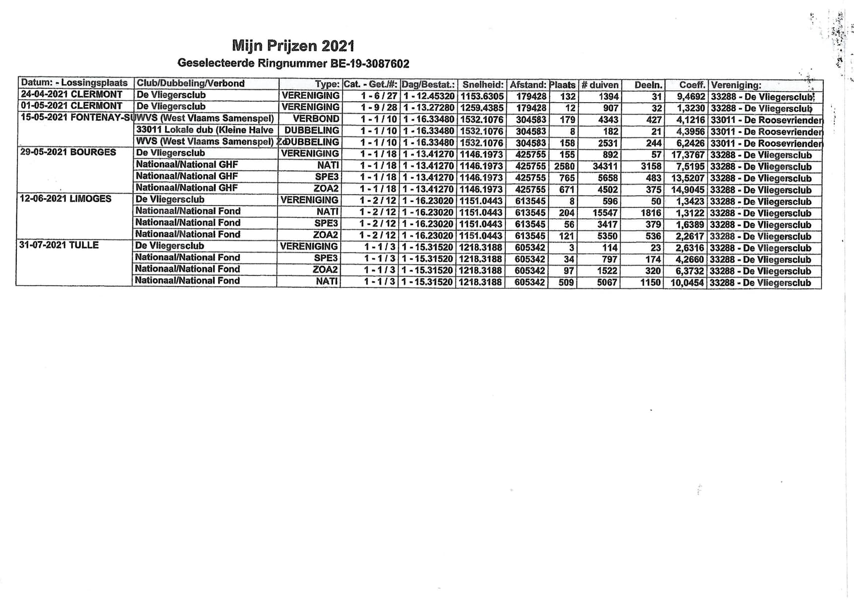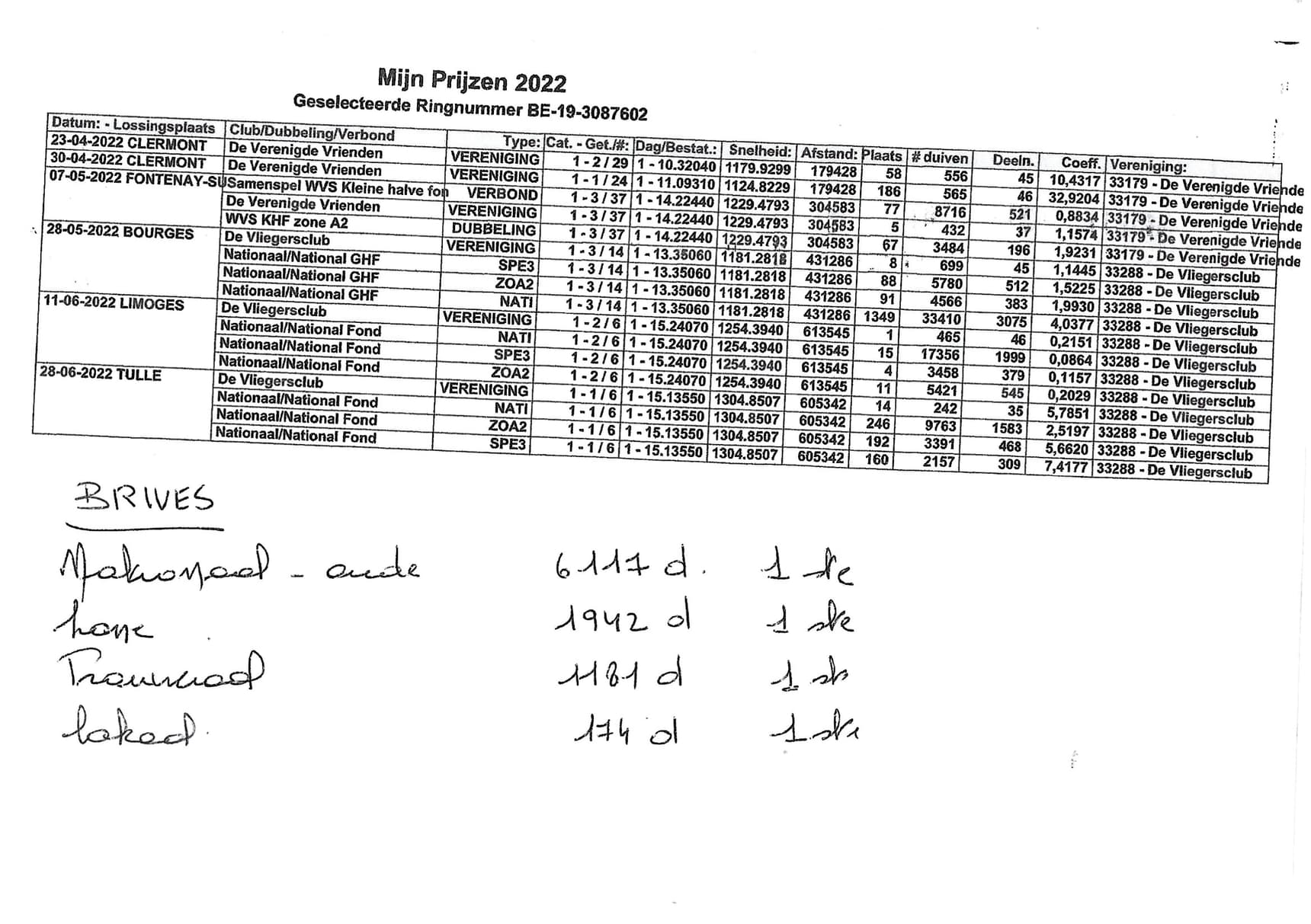 En dan zijn we bij de nationale winnaar Brive beland. De overwinning van “Wout” is geen toevalstreffer want eerder dit seizoen won hij reeds de 15e Nationaal Limoges 17.356d. en 246e Nat. Tulle 9,763d. Vorig seizoen won hij o.a. 204e Nat. Limoges 15.547d..