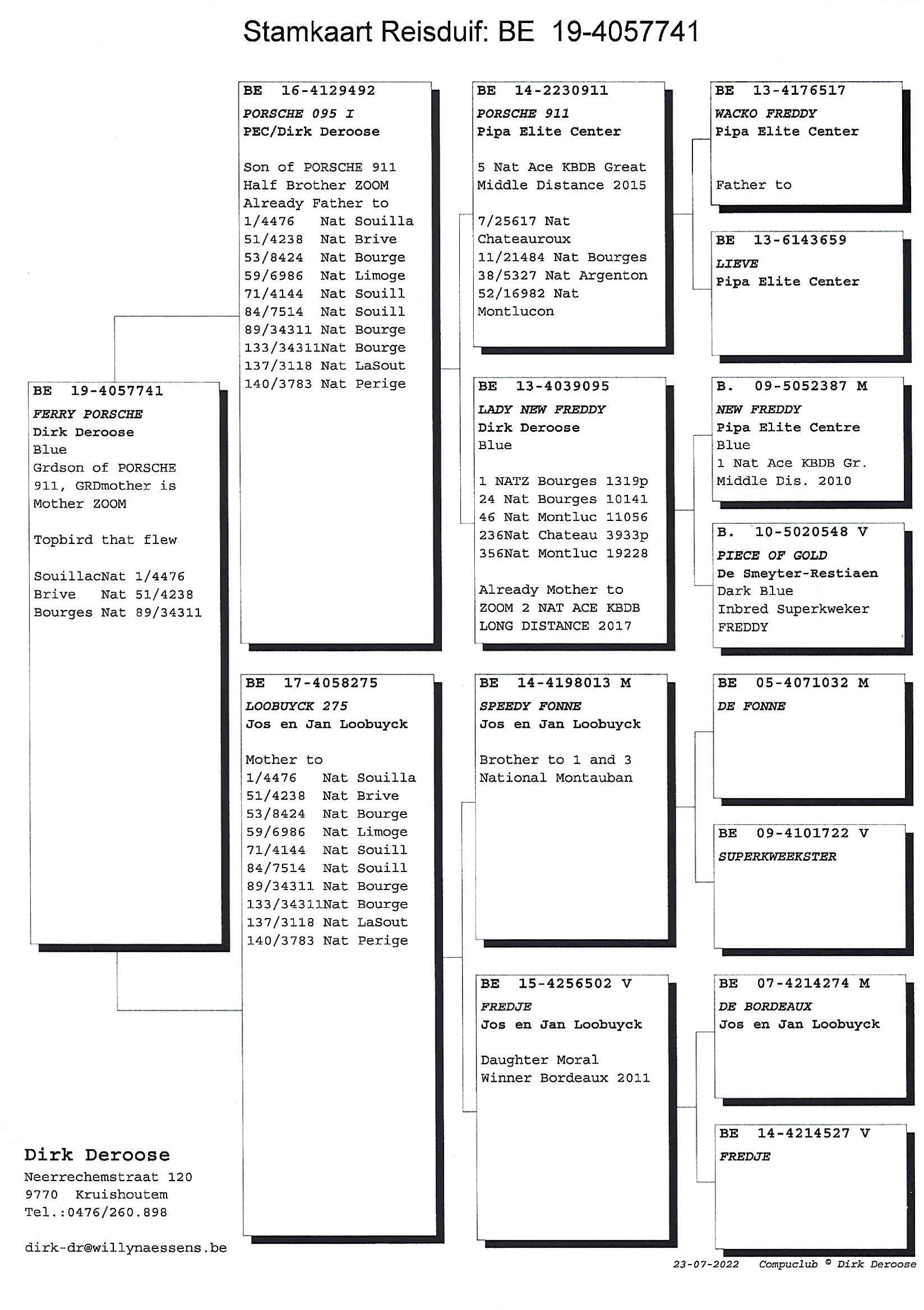 Nationale zege nummer 3 is een feit. In 2013 won zijn blauw duivinnetje “Klarisse” (B11-4234312) de 1e Nationaal Bourges tegen 9.639 oude duiven, nadien was er in 2017 “Marcel” (B15-4073372) een sublieme geschelpte duiver die met glans de 1e Nationaal Chateauroux voor zijn rekening nam en nu is er “Ferry Porsche” (B19-4057741) die nationaal Souillac op zijn reeds indrukwekkend palmares noteert.