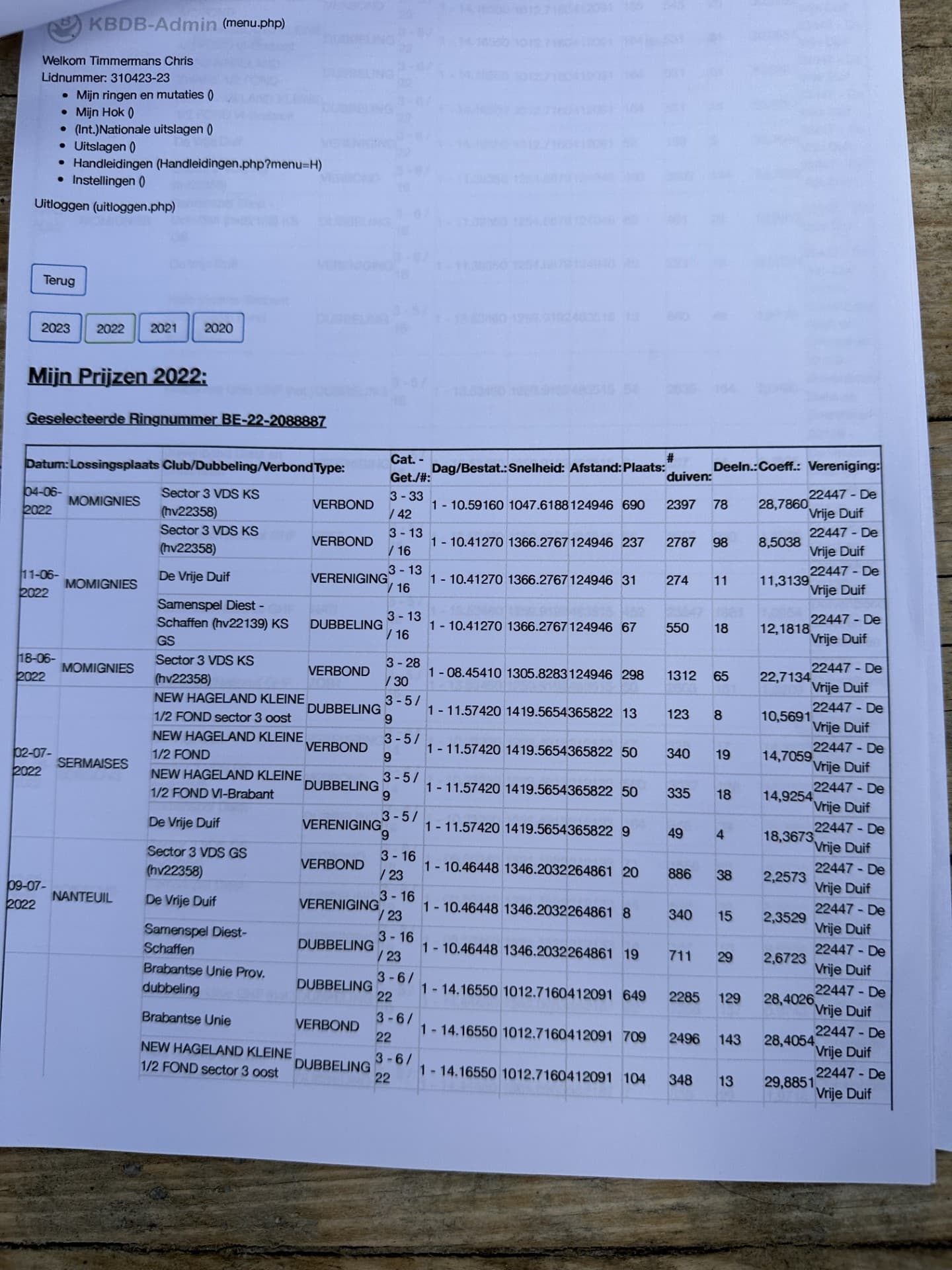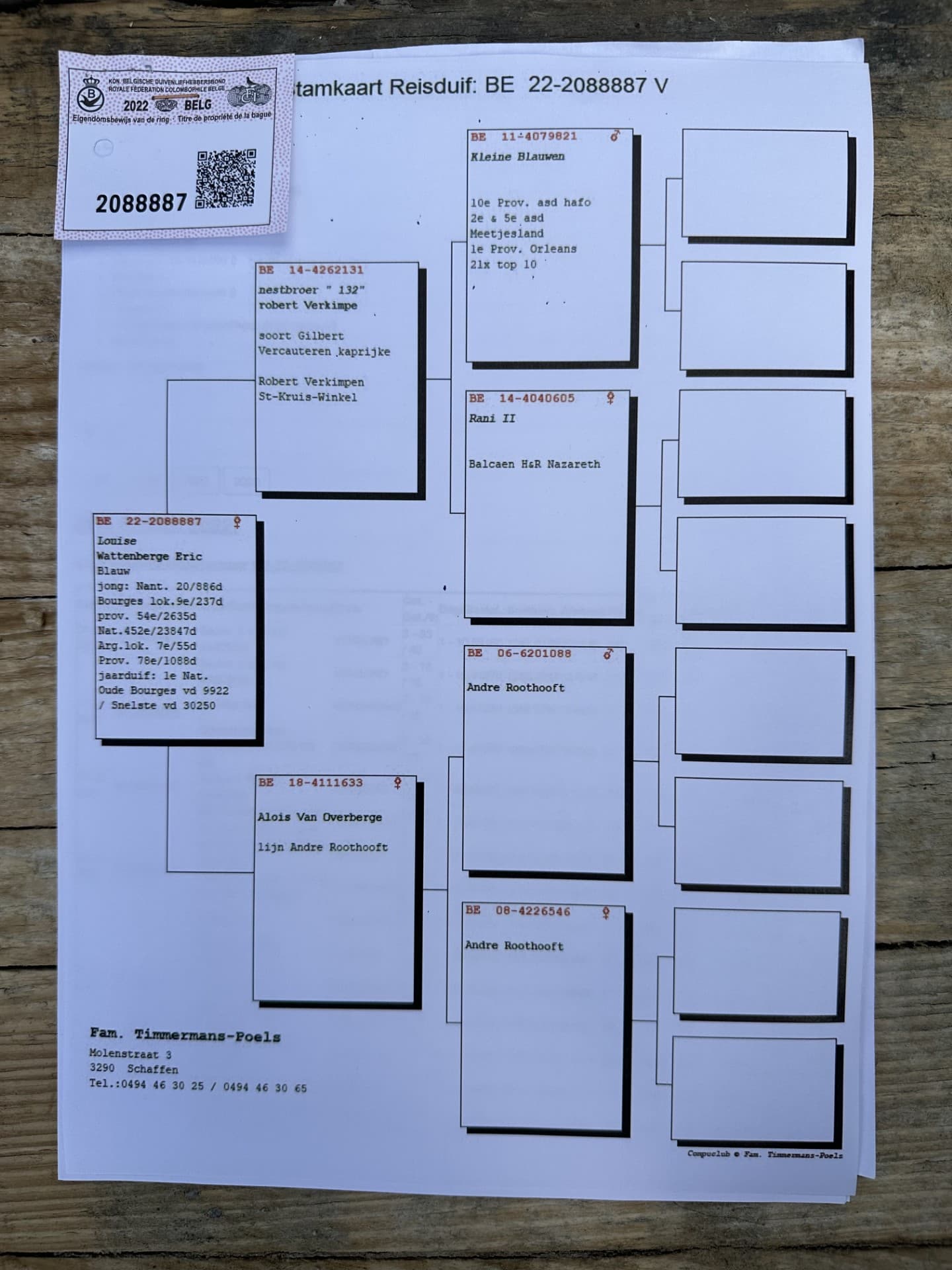 De nationale winnares komt rechtstreeks van bij Eric Wattenberge uit Lochristi. Ik heb zo mijn eigen manier van investeren. Ik ga bonnenverkopingen af en bonnen waar er weinig op geboden wordt krijgen mijn aandacht. Ik kijk dan de resultaten na en soms sta je versteld hoe hard sommige liefhebbers presteren. Op dezelfde manier kwam ik in contact met Eric en sinds een paar jaar wisselen we duiven uit.