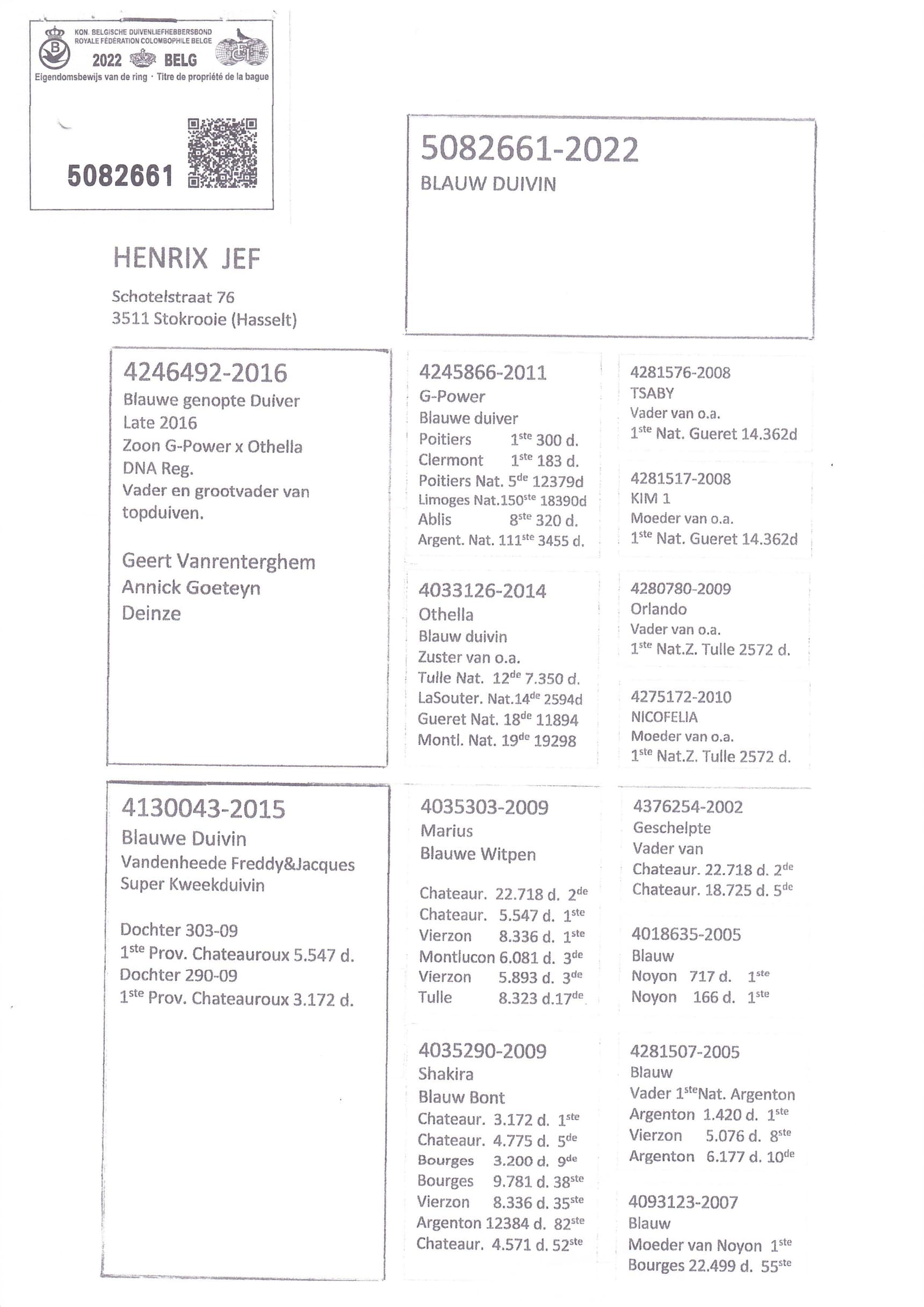 “Ik ben een liefhebber van de oude stempel en speel al mijn duiven op nest. Ik ben het seizoen met 70 duiven begonnen maar de roofvogel zit dagelijks op de loer en momenteel heb ik er nog een 40-tal om te spelen. Geheimen gaat u hier niet ontdekken, want van verduisteren, wegvoeren, enz… is hier helemaal geen sprake. Meestal speel ik de kleine halve fond en met de regelmaat van de klok staat mijn naam bovenaan de uitslag en om die reden stimuleerden vrienden me om het ook eens op een nationaal te wagen en zie…nu win ik Bourges nationaal. Mijn nationale winnares was 10 dagen aan het broeden en dit met een extra ei als stimulans.