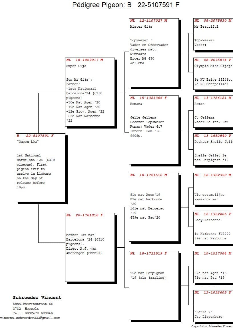 De winnares is een 2-jarige lesbische duivin die omstreeks 21u45 en 51 seconden de tijd ten huize Schroeder even stil liet staan. Wat volgde was emotie en fierheid voor deze duif en wat ze heeft gepresteerd. Later zou dus blijken dat ze de 1ste Nationaal Barcelona voor België won tegen 6.310 oude duiven. In het algemeen is Vincent duidelijk tevreden van zijn Barcelona ploegje, een hok in volle groei en opbouw had omstreeks 9u 7 duiven in de klok en om 14u45 11 duiven thuis van de 13. De bevestiging nadat hij in 2023 ook al 3de en 26ste provinciaal won op Barcelona tegen 922 duiven met amper 5 mee.