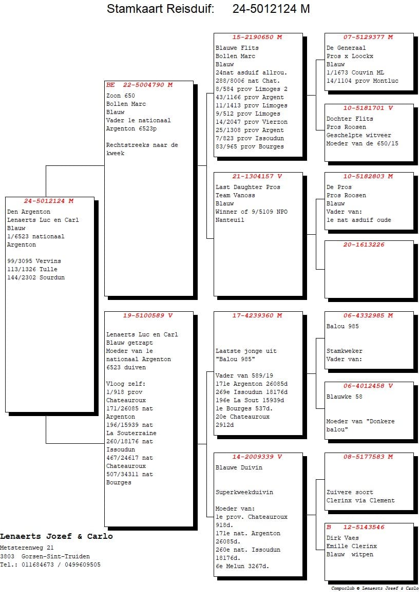 Argenton II kende een deelname van 6.523 jaarse duiven en nationaal winnaar werd de mooie blauwe weduwnaar van de broers Luc en Carlo Lenaerts uit Gorsem. De broers zijn aan een schitterend seizoen bezig want de teller van de “gewestelijke zeges” (en dan spreek je toch over gemiddeld 2000/2500 duiven) flirt met het getal 15! Als je dat ziet weet je dat de vliegploeg van de gebroeders Lenaerts de conditie te pakken heeft. Het hoogtepunt van hun “duivenliefhebbers carrière” werd afgelopen weekend behaald met het winnen van hun (voorlopige) eerste nationale zege.