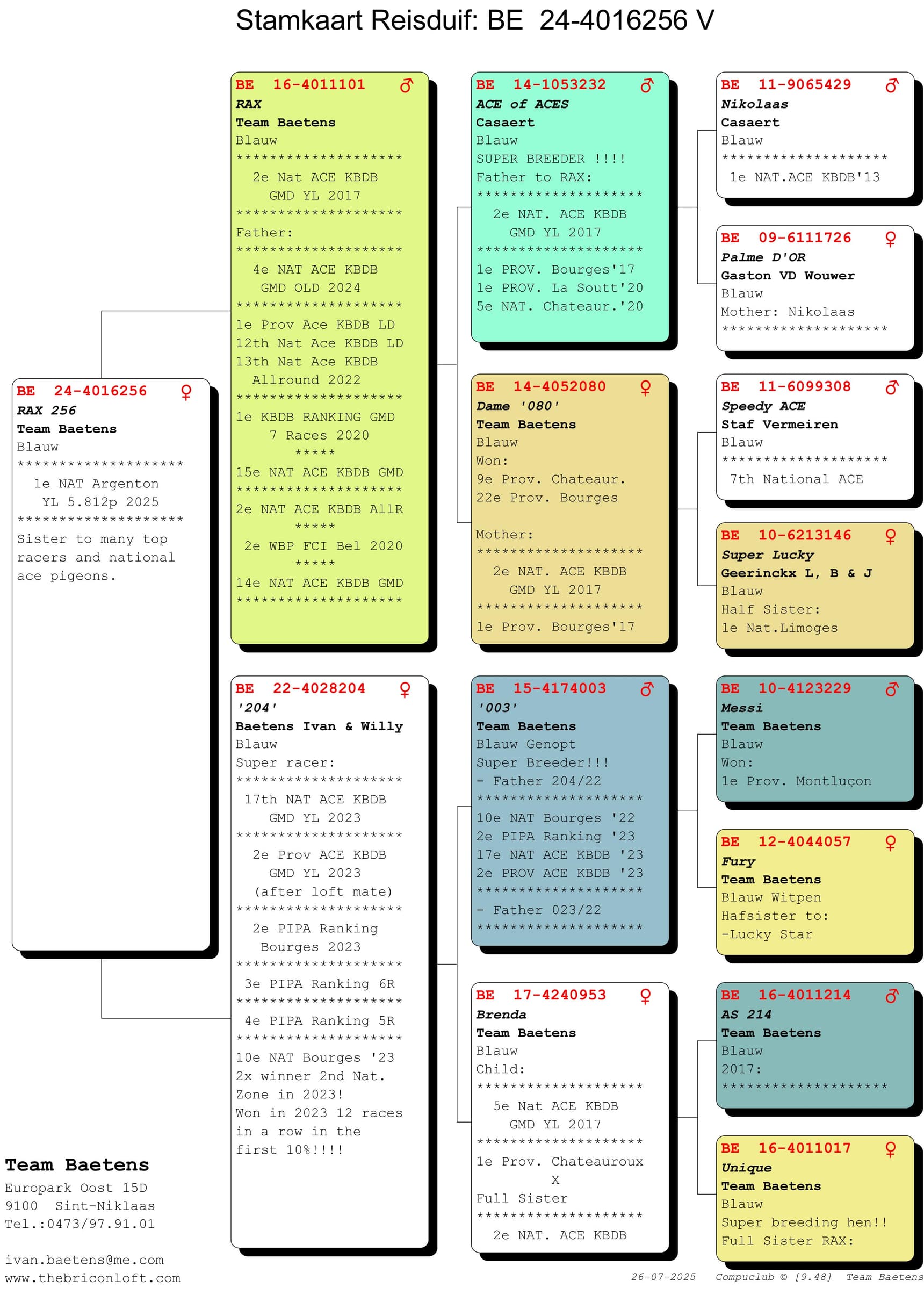Wel... hetzelfde weekend dat “Miss Argenton” bejubeld werd voor haar nationale zege won haar zus “LS 002” (B23-4003002) de 1e prijs provinciaal Orleans tegen 2.758 oude duiven en op het einde van het seizoen 2024 werd “LS 002” als 6e provinciale asduif KBDB Oost-Vlaanderen afgevlagd. Nu een jaar later wint “LS 002” de 1e nationaal Argenton tegen 4.077 oude en was ze de snelste van gehele lossing van 9.889 duiven. Hoe mooi kan de duivensport zijn… twee zussen die elk een 1e nationaal Argenton winnen. En om de klasse van de Baetens duiven nog eens dubbel en dik te onderlijnen, zowel “Miss Argenton” als “LS 002” zijn eveneens halfzussen , zelfde vader, van de 1e Nationaal Sancoins!