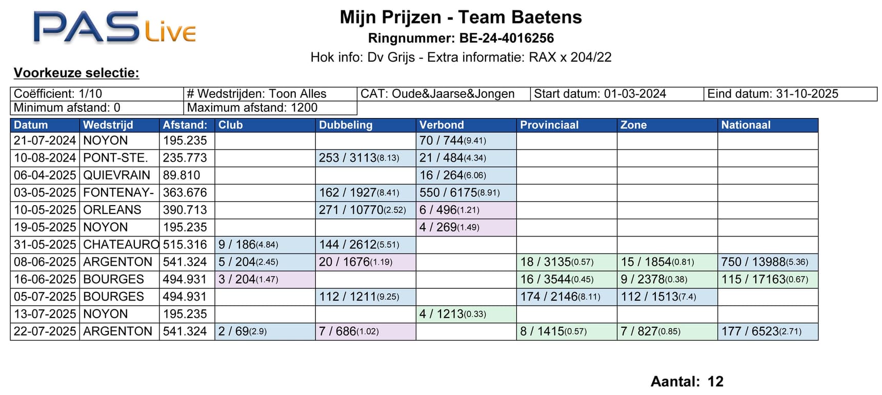 Een goede 2min30sec na “LS 002” klonk er opnieuw een biep van het Pas-systeem door de Sint-Niklaase lucht. Het was “Rax 256” (B24-4016256) die zich had laten registreren en ten huize Baetens wisten ze niet meer waar ze het hadden, toen ze zagen dat “Rax 256” de 1e nationaal Argenton in haar categorie tegen 5.812 jaarse duiven won.