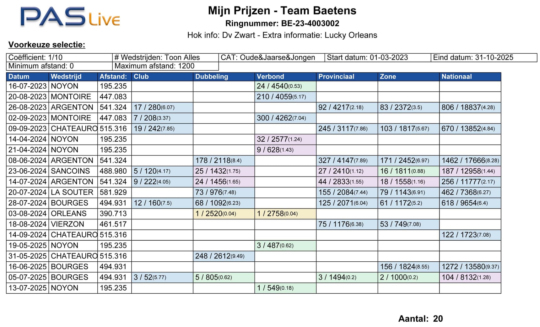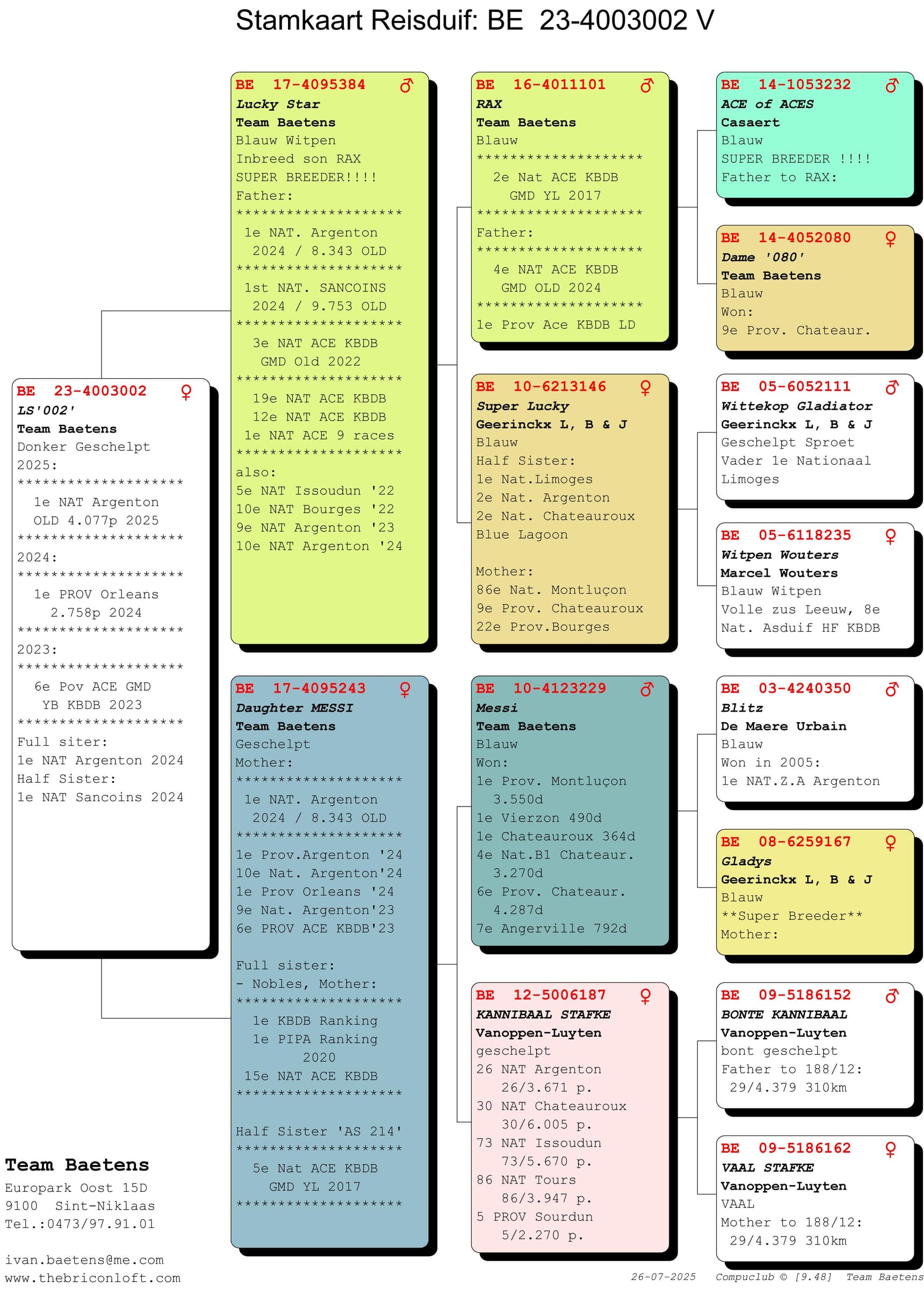 Wel... hetzelfde weekend dat “Miss Argenton” bejubeld werd voor haar nationale zege won haar zus “LS 002” (B23-4003002) de 1e prijs provinciaal Orleans tegen 2.758 oude duiven en op het einde van het seizoen 2024 werd “LS 002” als 6e provinciale asduif KBDB Oost-Vlaanderen afgevlagd. Nu een jaar later wint “LS 002” de 1e nationaal Argenton tegen 4.077 oude en was ze de snelste van gehele lossing van 9.889 duiven. Hoe mooi kan de duivensport zijn… twee zussen die elk een 1e nationaal Argenton winnen. En om de klasse van de Baetens duiven nog eens dubbel en dik te onderlijnen, zowel “Miss Argenton” als “LS 002” zijn eveneens halfzussen , zelfde vader, van de 1e Nationaal Sancoins!
