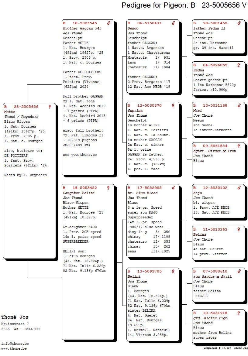 De nationale zege werd behaald door duivin “Mette”. “Mette” klopte de 18.627 oude Bourgesvliegers met een gemiddelde snelheid van 1.810 m/m. Op de vraag of “Mette” gemotiveerd was kon Nico niet direct een duidelijk antwoord geven maar hij had wel al opgemerkt dat er een 3e partner tussen het koppel gekomen was en misschien was dat de motivatie van “Mette” om deze zege binnen te halen.