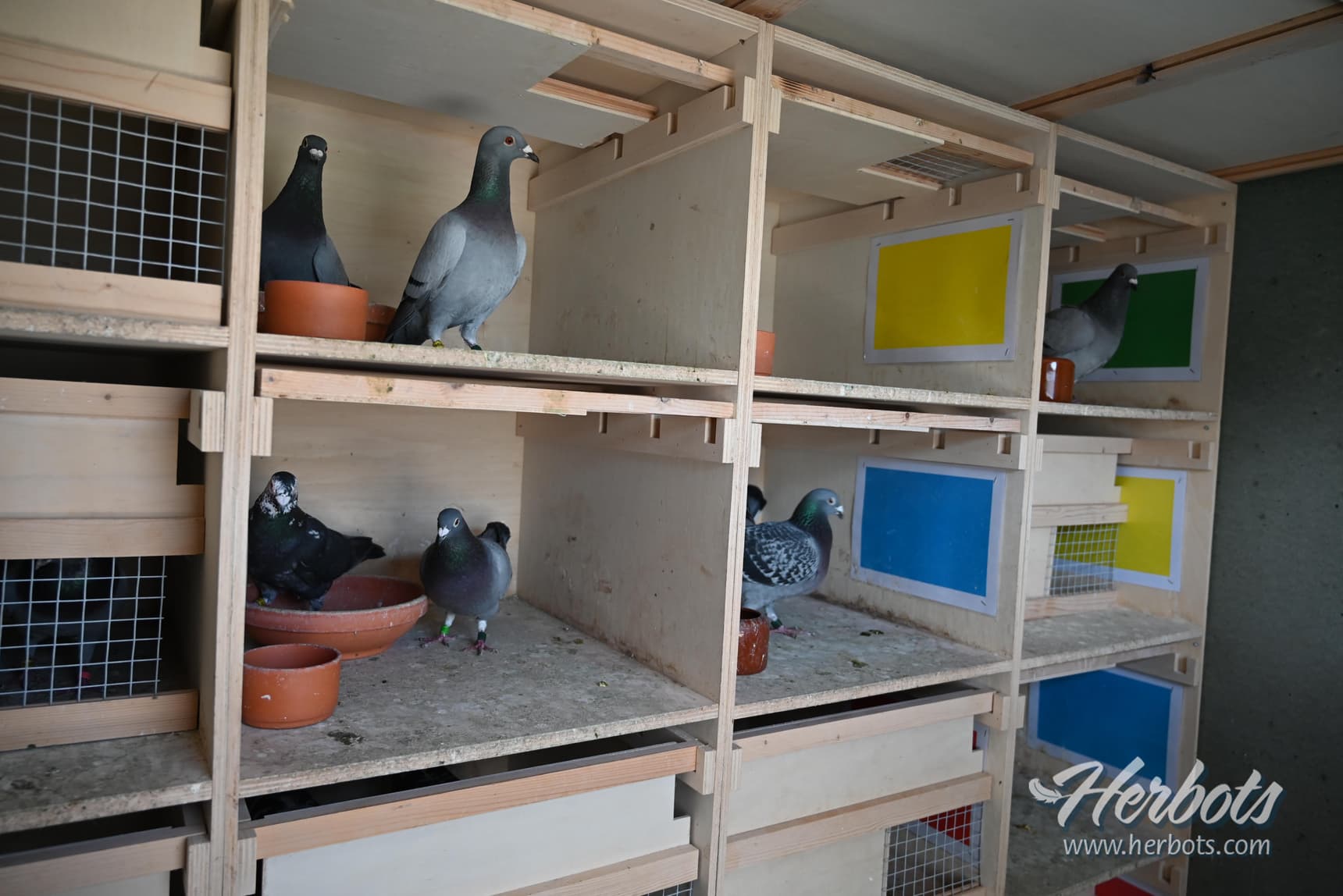 Het duivinnenhok is onderverdeeld in 2 afdelingen. In het eerste deel zijn er broedbakken en daarnaast een “rusthok” waarbij alles zo gestructureerd is dat de duivinnen niet kunnen paren. Aan het hok is er ook nog een hangvolière geïnstalleerd en bij warm weer worden de vliegduivinnen in deze volière opgesloten.