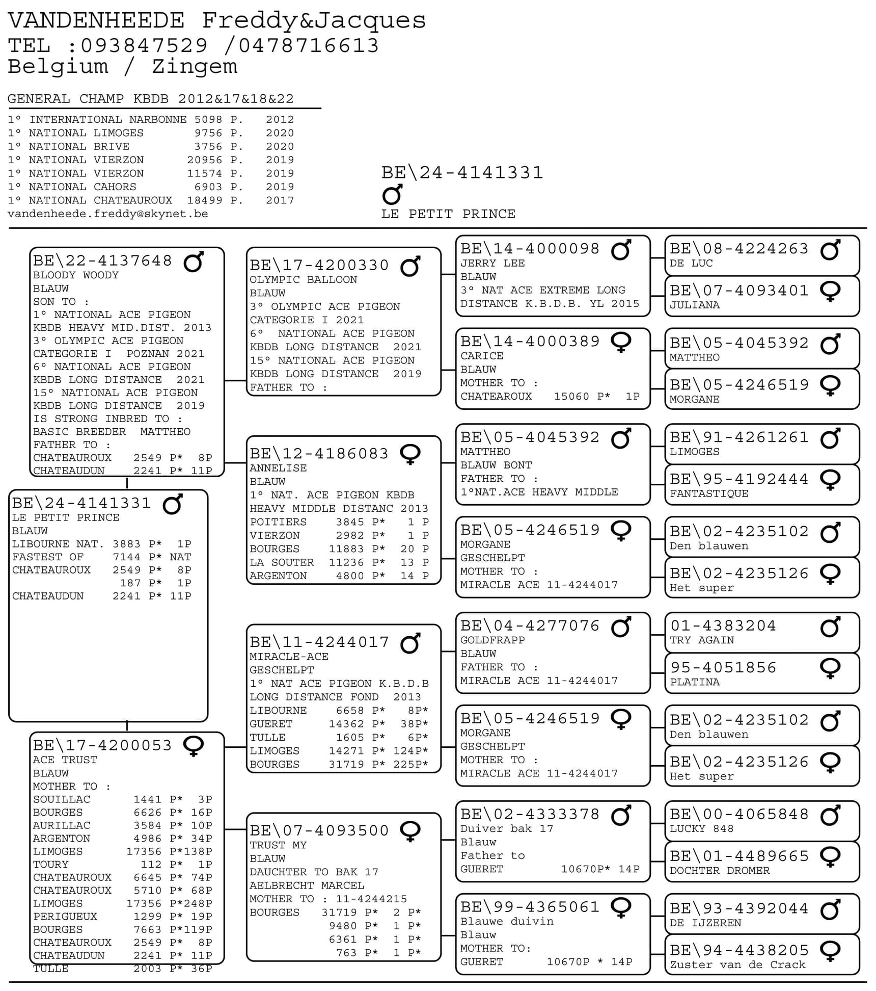 Nationale zege nummer 29 (sinds 1999) voor Gebroeders Vandenheede is een feit. Op 12 Juli wonnen ze nog met “Lord Souillac” (B24-4141105) 1e nationaal Libourne tegen 4.234 jaarse (snelste van 8.811 duiven) en nu was het aan “Le Petit Prince” (B24-4141331) om de nationale zege vanuit Libourne (743km) te winnen.
