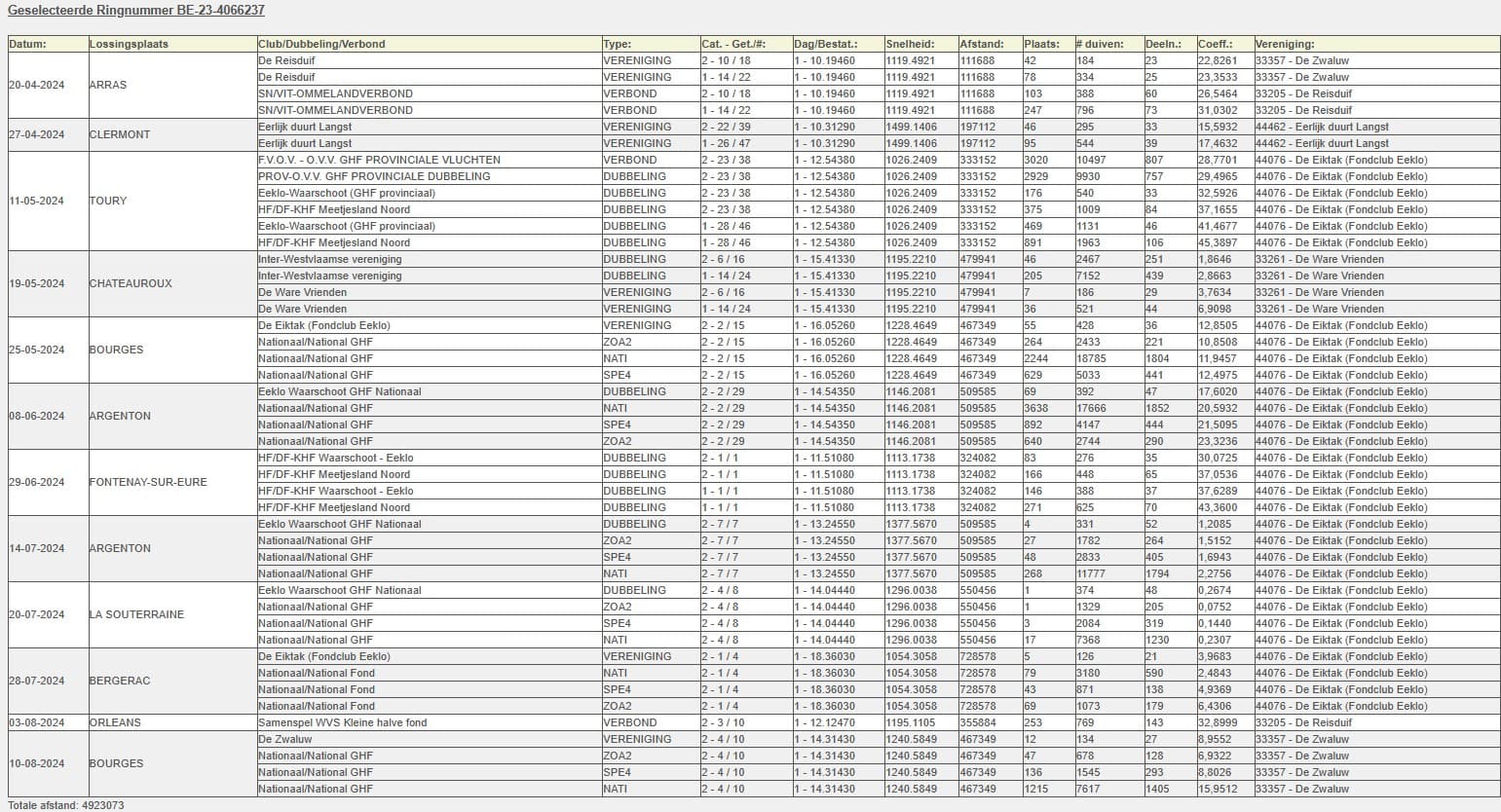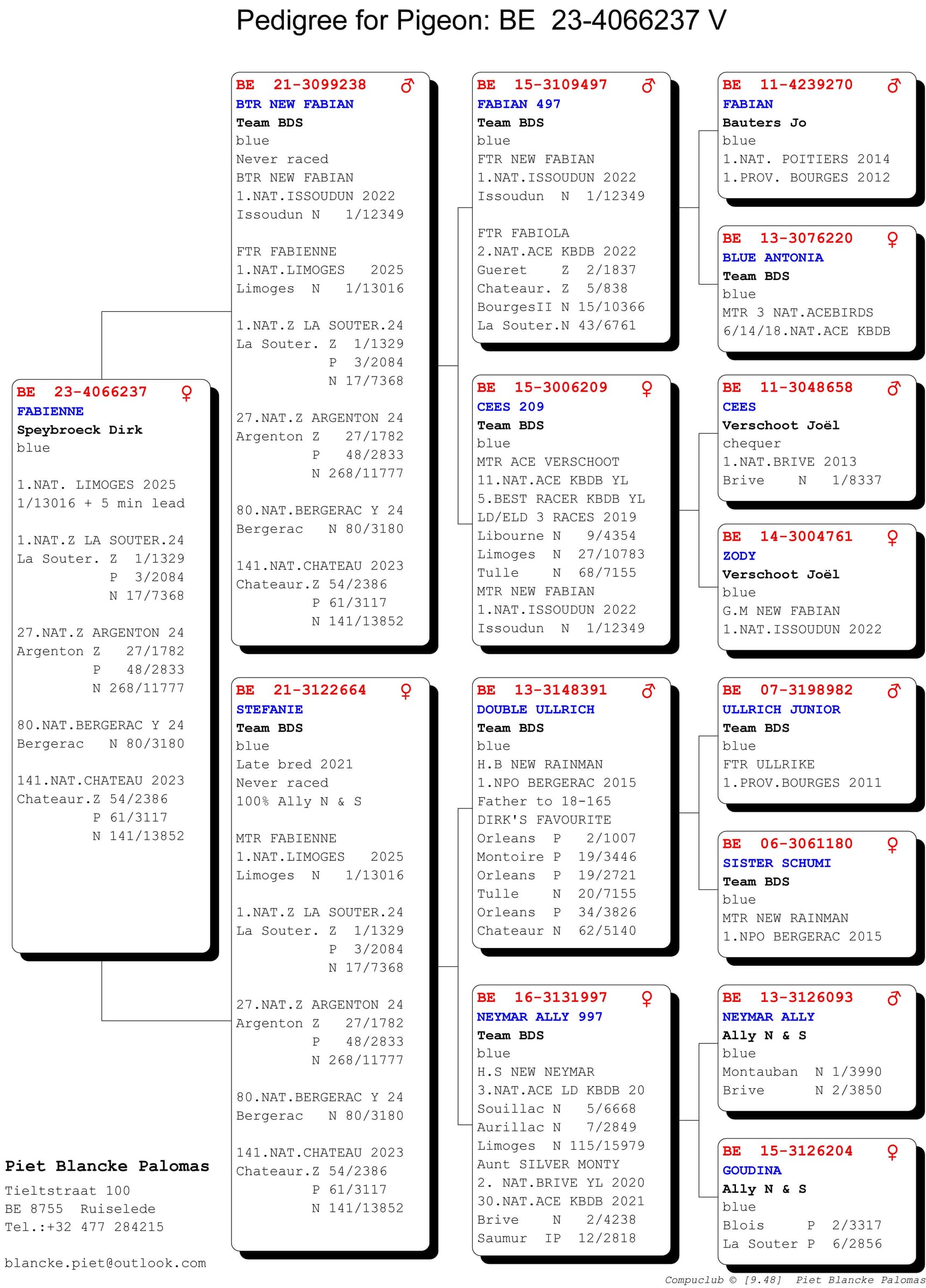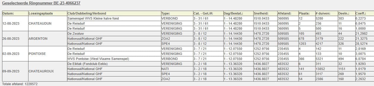 De winnende duivin “Fabienne” (B23-4066237) voelt als “pure kracht” aan. Ze is van het middelmatige type, maar heeft een ijzeren karkas en een grote vleugels met de ideale ventilatie tussen de pennen. “Fabienne” was niet aan haar proefstuk toe. Bekijk maar rustig haar volledige palmares dat verder in de fotoreportage opgenomen is. Daarin zal je topprestaties zoals 1e Nat (z) en 17e Nat. La Souterraine 7.368d. – 80e Nat. Bergerac 3.180d. en 141e Nat. Chateauroux 13.852 terug vinden.