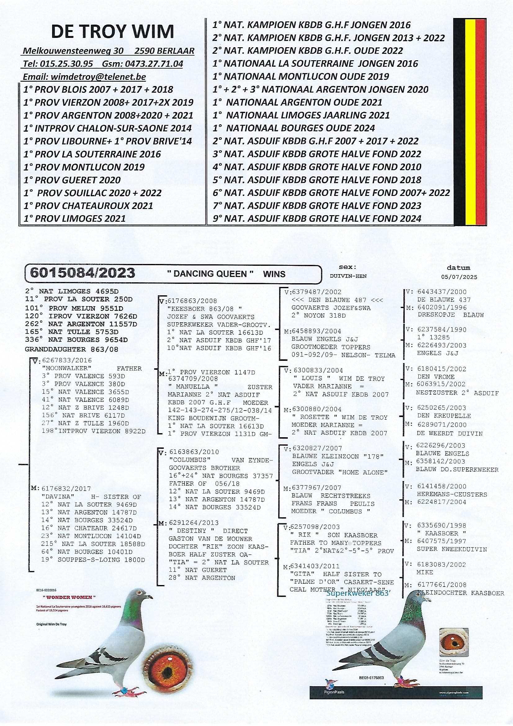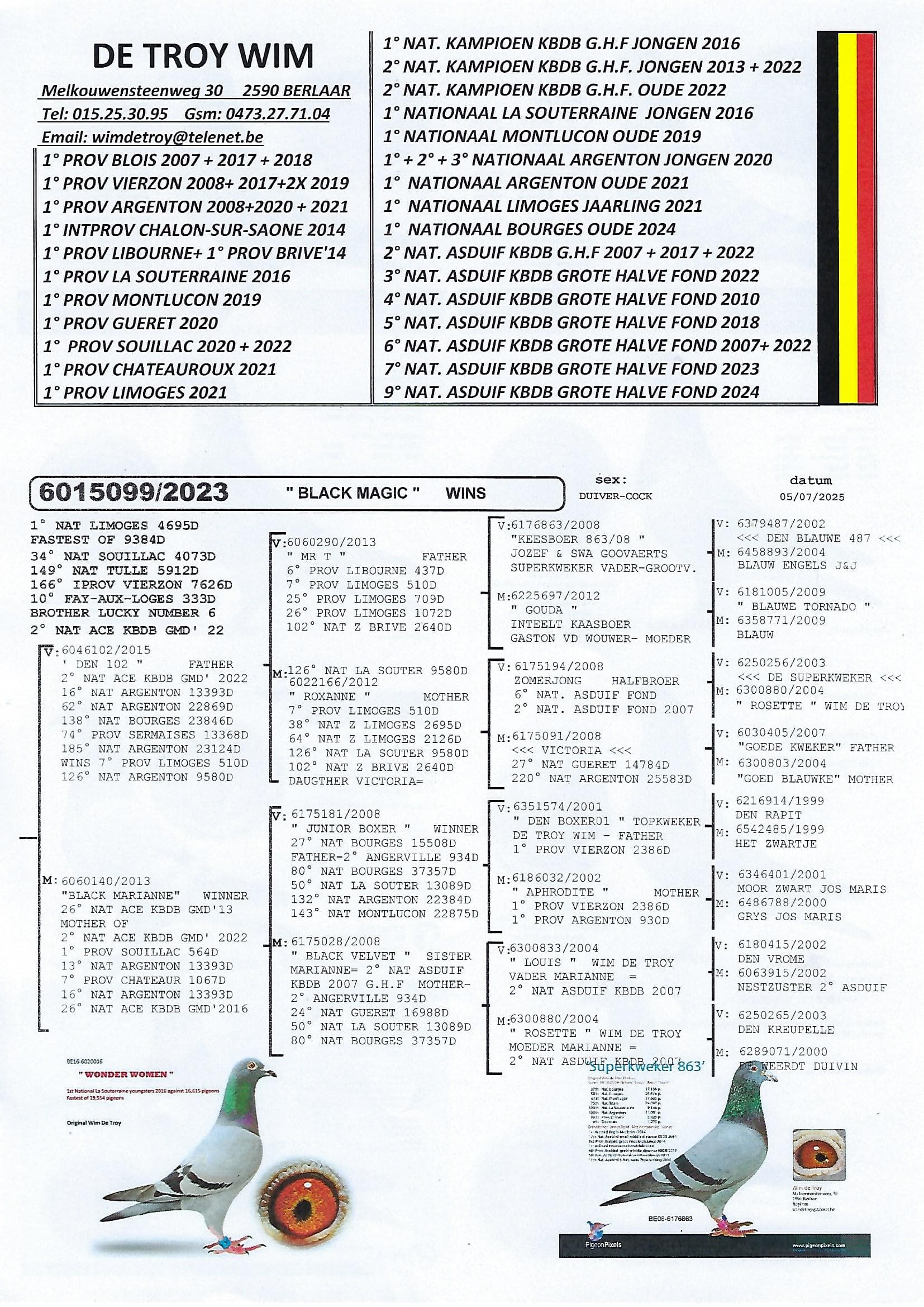 Steven: We stonden met 13 oude en 6 jaarse duiven aan de inkorftafel van Limoges. Voor de jaarlingen was het de eerste maal dat ze voor een fondvlucht ingekorfd werden en daarom waren de verwachtingen om een mooie uitslag bij de jaarse duiven te maken, niet zo hoog. We verwachten een goede uitslag te maken met de oude duiven en kijk ze ontgoochelden niet. Tegen 4.695 oude duiven wonnen ze: 1-2-11-33-73-186-204-714-1065 (9 prijzen van 13). Toen we de eerste aanmeldingen op de KBDB website zagen hadden we de indruk dat de duiven meer westelijk het land bestormden. We vonden dat een beetje raar want de wind blies westelijk en ook de winnaars en kopduiven van de eerder vervlogen nationale Bourges vlucht zaten in onze contreien. Om 15u02 en 26sec liet onze eerst getekende weduwnaar “Black Magic” (B23-6015099) zich registreren. Met een gemiddelde snelheid van 1.327 m/m was hij de snelste van het hele Limoges peloton. Amper 2 minuten later klokten we een duivin “Dancing Queen” (3e getekende) , goed voor de 2e nationaal.
