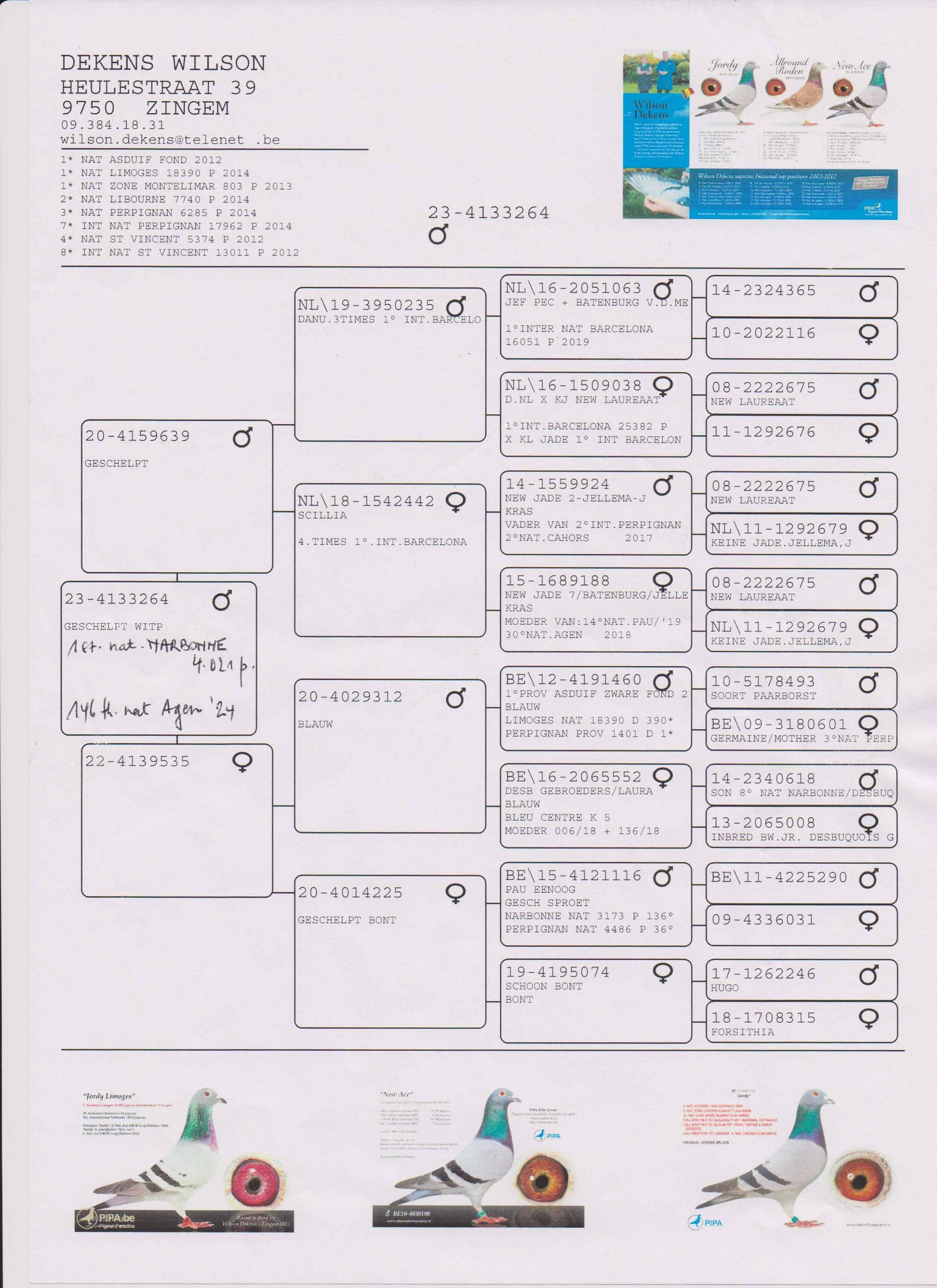 De BE23-4133264 werd hieruit gekweekt en zoals iedereen normaliter moet doen vloog hij als jaarling Agen en Narbonne. Narbonne jaarlingen is traditioneel zwaar en jaarlijks is dit voor de jaarlingen van Wilson het ultieme examen. Wie naar huis komt van Narbonne mag blijven…ook de 264 dus. Op Agen als jaarling vloog hij de 146e nationaal.