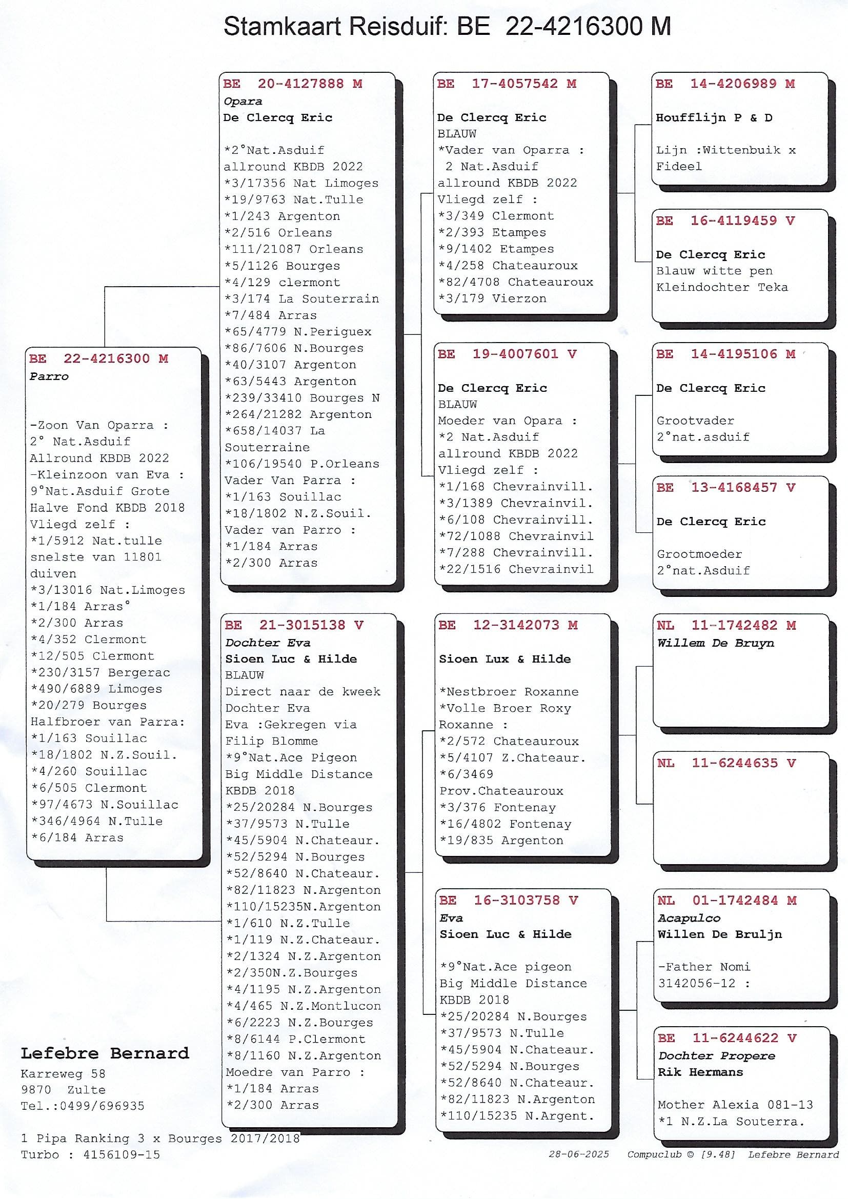 Qua afstamming komt “Parro” uit het allerbeste wat de Lefebre kolonie te bieden heeft. Zijn vader is “Opara” (werd 2e Nat. asduif KBDB Allround ’22 – won 3e nat. Limoges 17.356d. en 19e nat. Tulle 9.763d., tevens ook 1e Argenton en 2e Orleans - 100% De Clercq Erik ) x “Daughter Eva” (origineel Luc en Hilde Sioen via Blomme Filip. “Eva” won 9e nat. asduif KBDB grote halve fond en won 25e, 37e, 45e, 52ee, 52e en 82e nationaal)